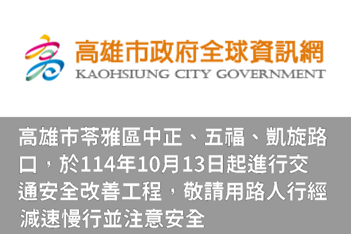 高雄市苓雅區中正、五福、凱旋路口,於114年10月13日起進行交通安全改善工程,敬請用路人行經減速慢行並注意安全