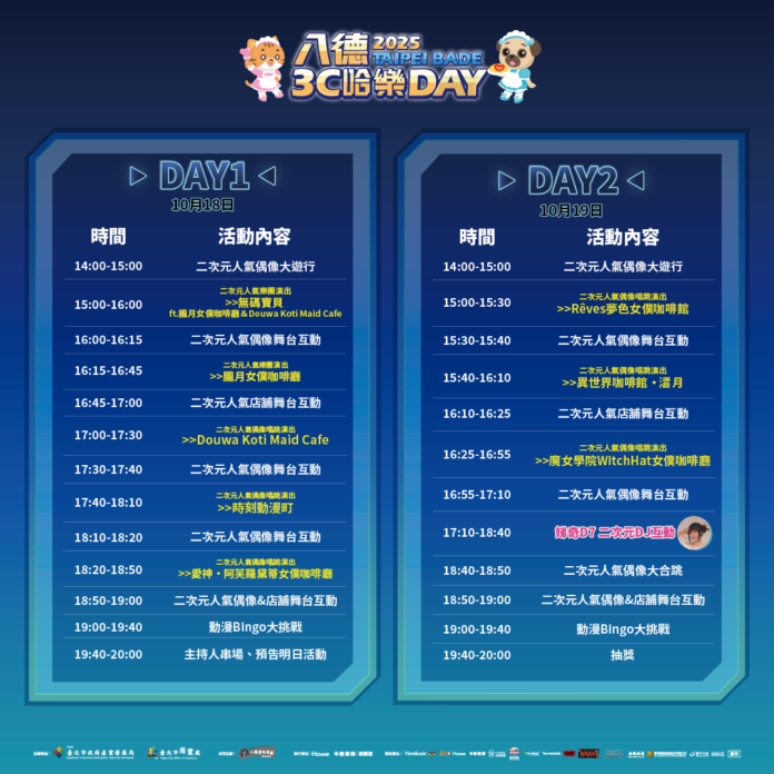 舞台區同樣熱力滿點,10月18日除知名樂團「無碼寶貝」與現場偶像聯手帶來跨次元合作演出,週末2日也有多組充滿魅力與個性的二次元偶像輪番登場帶來華麗又療癒的視覺饗宴!10月19日「二次元週」尾聲更將迎來壓軸「二次元偶像大合跳」,眾多偶像齊聚舞台前,萌系光環光芒四射,電翻八德資訊商圈!