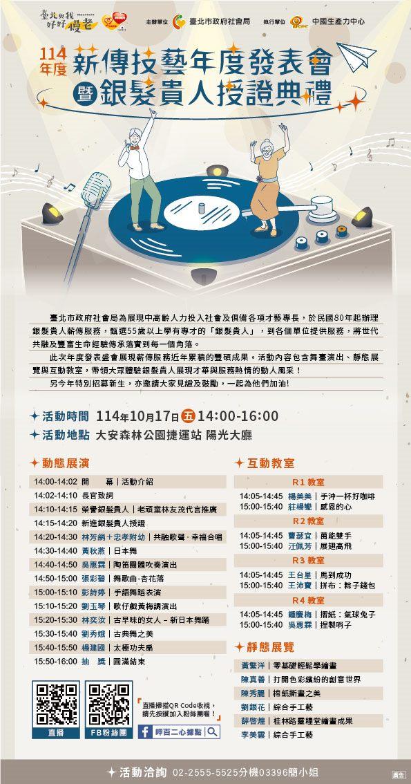 臺北市政府社會局114年重陽系列活動開跑!首先將由銀髮貴人薪傳技藝年度發表會於10月17日下午2點假捷運大安森林公園站陽光大廳盛大展開!