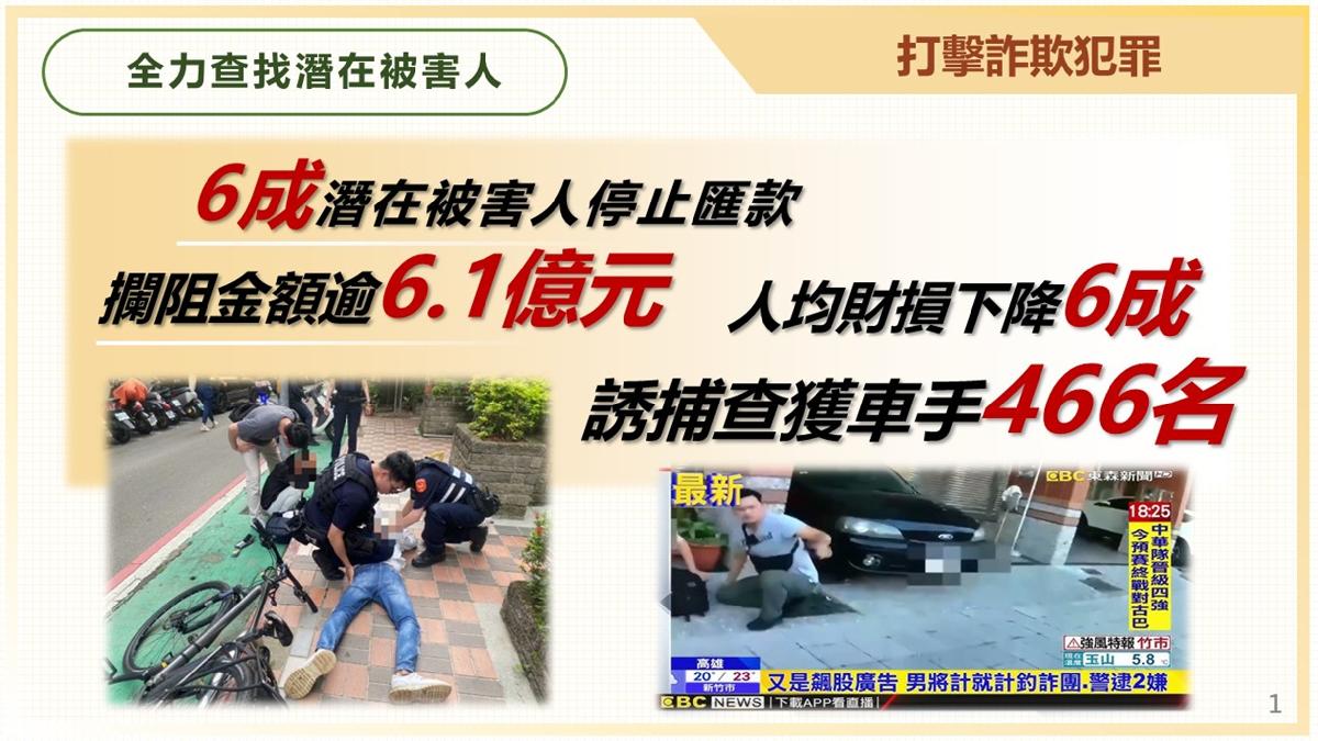 內政部今(16)日部務會報安排警政署報告「建立潛在詐欺被害防護網之策進作為」。部長劉世芳表示,警政署自112年6月起全面推動「查找潛在詐欺被害人」工作,防制假投資等高額財損詐欺案件,透過分析警示帳戶交易明細、調閱金融金流資料及擴大查訪通報機制,及早中斷詐騙歷程,防止民眾遭受鉅額損失,另更擴大其他查找潛在被害人管道,統計至114年9月底,已查找潛在被害人超過10萬人次,成功攔阻詐騙款項逾6億元,並協助查獲逾400名車手,有效打擊詐欺犯罪鏈。