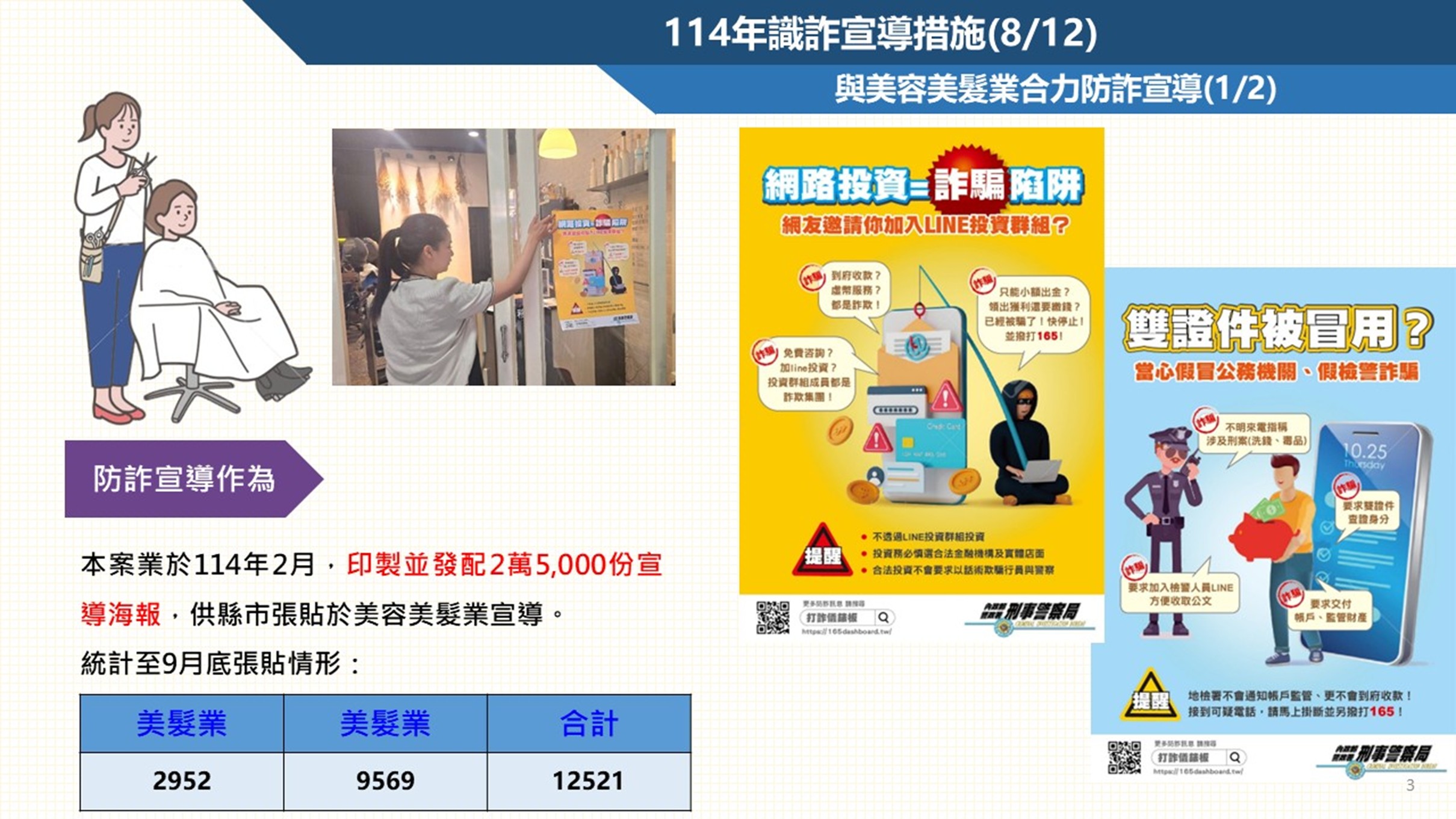 內政部強調,面對近期詐欺新趨勢,內政部針對「全民+1政府相挺」普發現金詐騙及花蓮賑災假募款案件,即時發布宣導圖文及新聞稿,觸及數百萬人次。另鎖定美容美髮業等高風險族群,於全國逾1萬2千處張貼防詐素材,全方位強化全民防詐意識。未來將持續強化跨部會合作,建置潛在被害人資料庫,透過科技偵查、數據分析及多元宣導,與金融機構、壽險業者及地政單位共同查核及關懷攔阻,落實公私協力防詐體系,守護民眾財產安全。