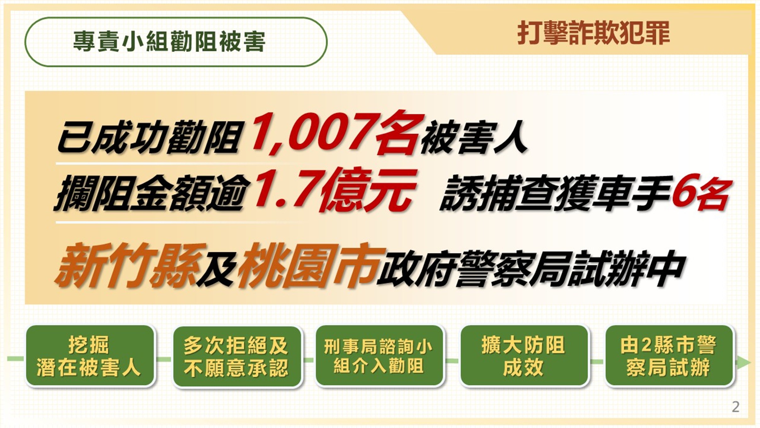 內政部說明,詐騙集團多以話術、偽造投資平台等手法誘騙民眾投入鉅額資金,部分被害人甚至抵押房產或貸款投資,財損金額動輒數百萬元以上。為強化勸阻效果,警政署刑事警察局於114年1月成立「詐欺防制諮詢小組」,由專責人員針對多次否認受騙的高風險個案,加強說服並協助識別詐欺手法,自成立以來已成功勸阻1,000餘名潛在被害人,攔阻金額達1.7億餘元,並於新竹縣政府警察局及桃園市政府警察局試辦諮詢小組,建構更完善的防詐網絡。