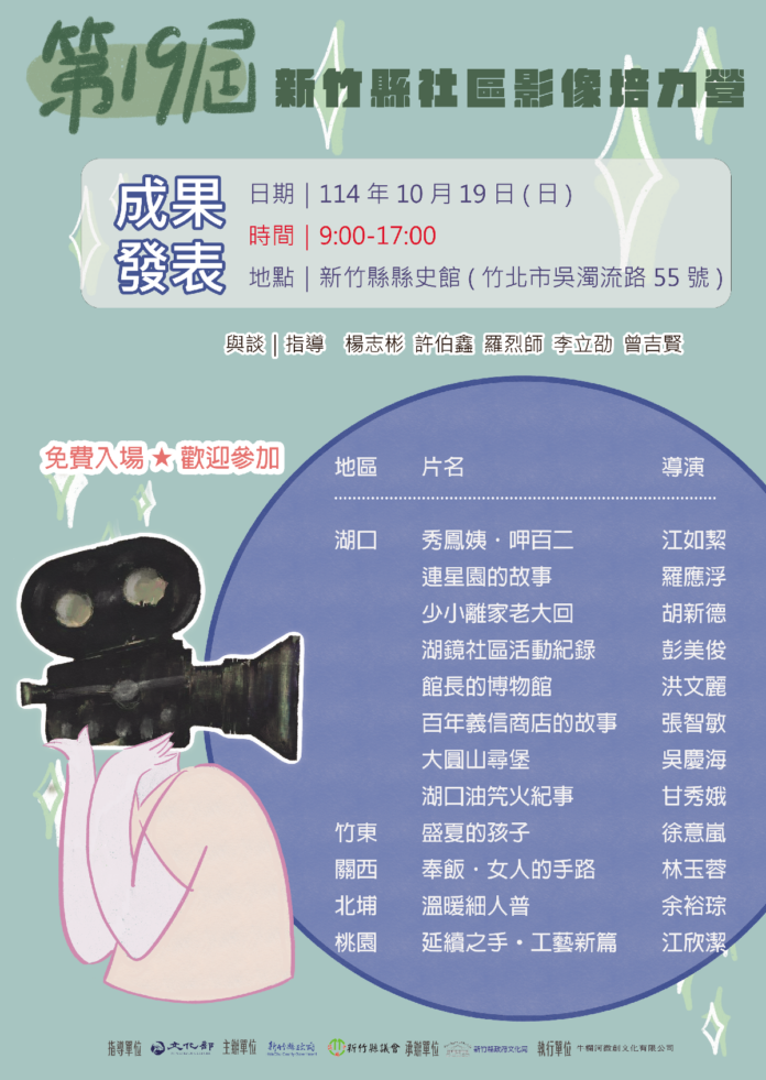 新竹縣政府文化局長期推動社區影像紀錄培力計畫,將於10月19日上午9時,在縣史館一樓大廳舉辦「新竹縣社區影像紀錄成果展」,邀請民眾免費入場,一同欣賞12部深耕社區的精彩影片,並參與映後座談會,用影像了解新竹縣多元的生活樣貌,也讓社區影像的感動觸及至更多民眾心中。