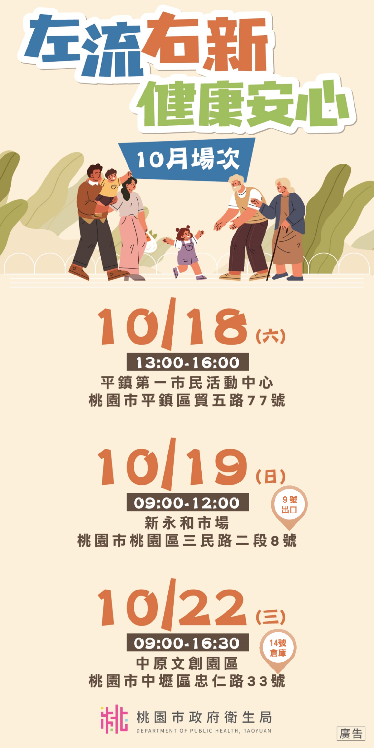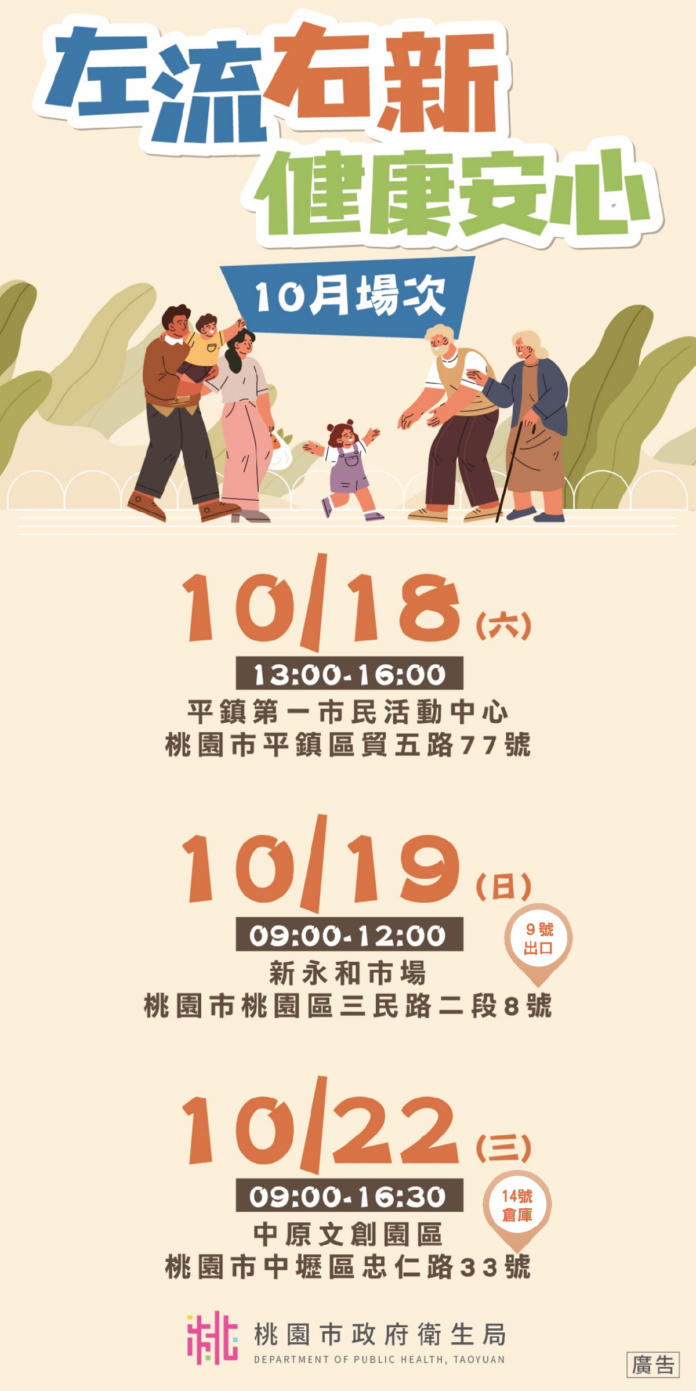衛生局表示,今年秋冬,流感與新冠病毒皆有可能同時流行,而施打疫苗仍是預防感染、降低重症與住院風險的最有效方法。為方便市民就近接種,10月份特別規劃了三場大型社區接種站,分別於10月18日(六)平鎮第一市民活動中心、10月19日(日)新永和市場9號出口,以及10月22日(三)中壢區中原文創園區14號倉庫舉辦。其中,10月22日場次更是重陽節特別場,專為65歲以上長者規劃。