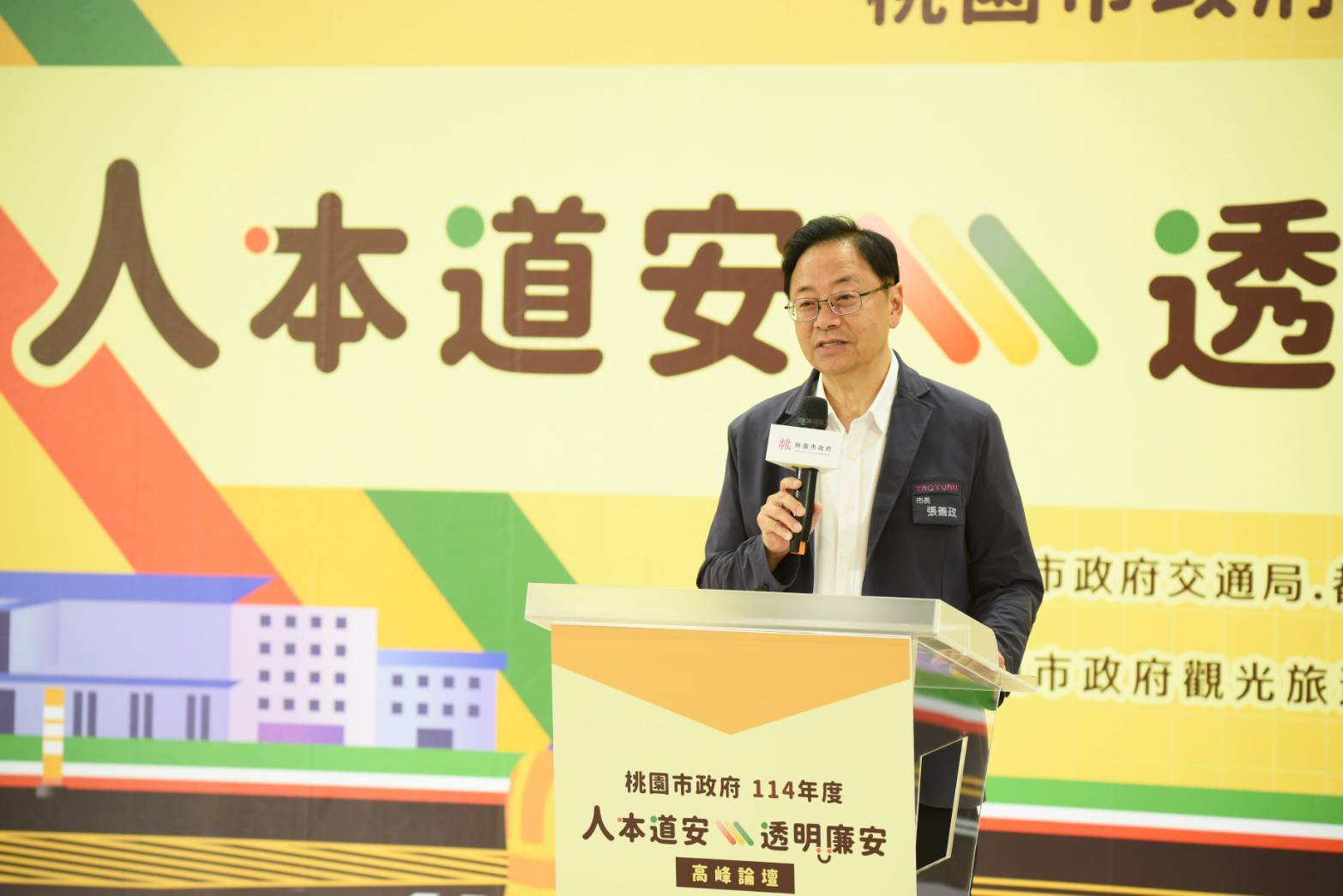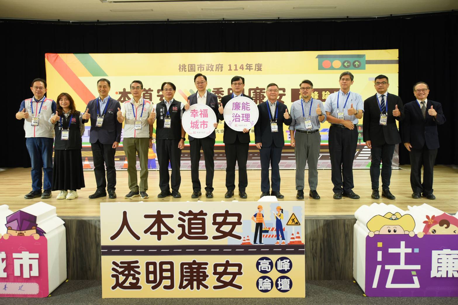 為強化公共工程廉政治理、健全交通建設及完善行政透明機制,桃園市政府今(14)日上午於桃園市綜合會議廳舉辦「人本道安.透明廉安」高峰論壇,聚焦「工程倫理」、「採購實務」及「透明治理」三大主軸,論壇由張善政市長開場主持,出席貴賓包含法務部廉政署主任秘書孫治遠、行政院公共工程委員會專門委員陳仲祐、國立中央大學土木工程學系教授陳世晃、台灣透明組織協會理事長葉一璋及市府相關局處首長共同見證成果,本場活動亮點包含國立中央大學土木工程學系師生、道路交通工程產業代表齊聚一堂,透過跨域對話與專業交流,提升工程倫理觀念與風險管控意識,攜手打造廉潔、專業且誠信的工程環境。