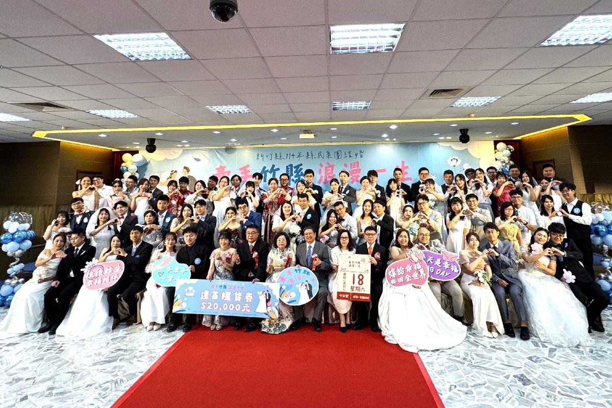 114年度新竹縣集團結婚以「牽手竹縣、浪漫一生」為主軸,今天(18日)上午於新竹縣議會大禮堂隆重登場,由新竹縣長楊文科夫妻擔任證婚人,新竹縣議長張鎮榮夫妻擔任主婚人、副議長王炳漢夫妻作為介紹人,在與親友的共同見證下,36對新人互許終身,攜手邁入人生的新里程碑。
