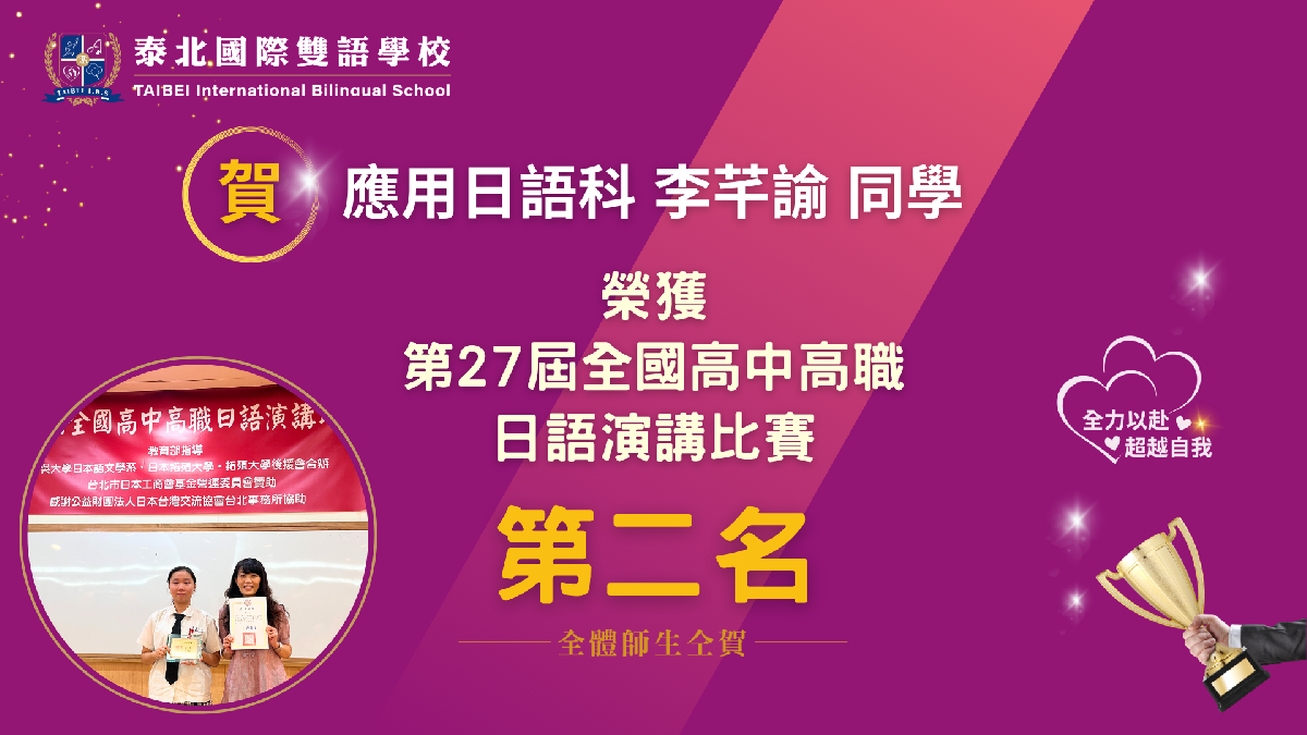 李芊諭同學此次的佳績,正是應用日語科「發掘潛能、成就每一個孩子」理念的最佳詮釋。學校以專業師資與個別化指導,協助學生在語言學習與學習歷程中找到自己的節奏與光芒,讓語言成為他們通往世界的橋樑。