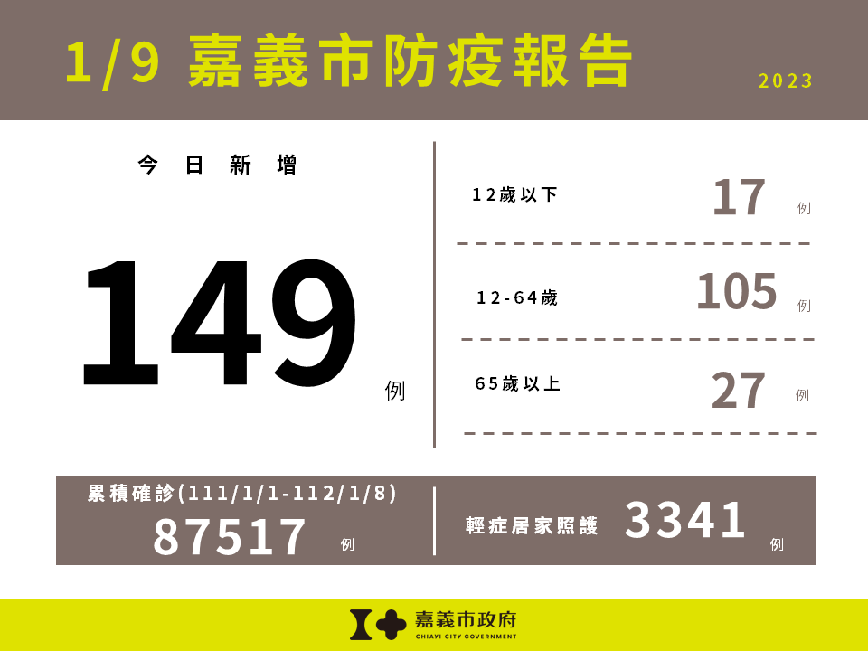 中央流行疫情指揮中心今(1/9)日公布嘉義市新增149例確診個案,包含12歲以下17例,12-64歲105例,65歲以上27例。嘉義市目前輕症居家照護人數3,341人。111/1/1截至112/1/8嘉義市累計確診嚴重特殊傳染性肺炎本土病例數為87,517人。 新年春節就在一周後,疫苗接種後約2週後開始產生保護力,為降低返鄉及旅遊人潮傳播風險,請大家盡快接種COVID-19疫苗,無論是否曾確診,符合間隔時間者均建議追加接種「BA.5次世代疫苗」,嘉義市更加碼給符合接種的各年齡層民眾至「嘉義市COVID-19疫苗合約醫療院所」接種「任何一劑的COVID-19疫苗」,即可獲得精美浴巾1條,數量有限送完為止,相關接種訊息請至衛生局網站/主題專區/COVID-19疫苗接種資訊專區(https://health.chiayi.gov.tw/cp.aspx?n=7501)查詢。 衛生局提醒,中國本土疫情嚴峻,其春運期間城市和農村人口流動性將對疫情產生重大影響,預期春節前、後人流將使疫情再上升,整體疫情可能持續逾3個月,加上台灣本土疫情升溫,請務必持續落實「勤洗手、咳嗽禮節及佩戴口罩」等防疫措施,避免出入人多擁擠的場所及高感染傳播風險場域,如出現疑似症狀,儘速快篩就醫和遵從醫囑及早服藥,降低重症及死亡風險;並請養成規律運動、均衡飲食、充足睡眠、壓力調適、不吸菸等健康習慣,提升免疫力,守護自己與家人的健康。