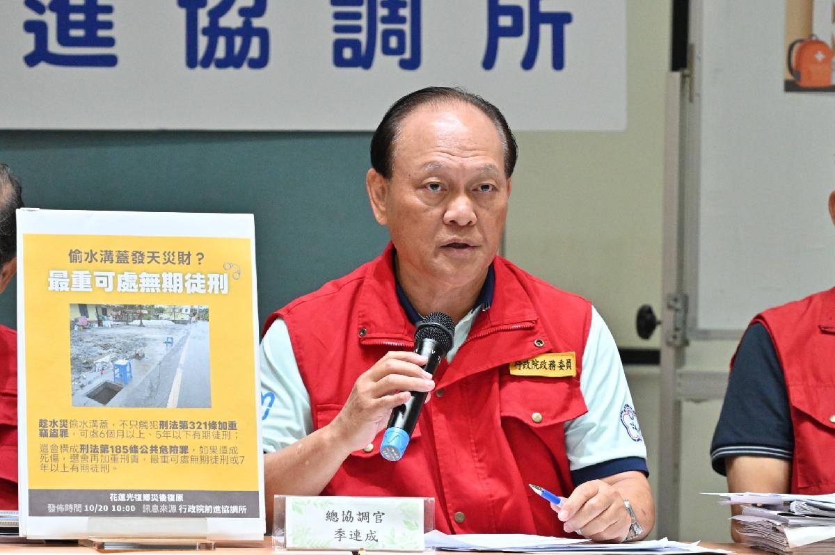 中央災害應變中心前進協調所今(20)日召開「光復鄉災後復原專案中央前進協調所記者會」,由總協調官行政院季連成政務委員說明馬太鞍溪及立霧溪燕子口堰塞湖監控狀況,以及未來中央前進協調所轉型為「馬太鞍溪堰塞湖災後復原重建中央協調會報」後,該協調會報項下所設九大功能分組之辦理業務及分工。針對馬太鞍溪及立霧溪燕子口堰塞湖監控狀況,季總協調官首先說明,昨(19)日馬太鞍溪所在的南花蓮地區雨量約20毫米,今日預估雨量介於20至30毫米,堰塞湖水位無顯著變化;而立霧溪所在的北花蓮地區,昨日雨量約33毫米,今日雨量約50至80毫米,目前立霧溪燕子口堰塞湖監測水位正常,無溢流狀況出現。季總協調官表示,目前馬太鞍溪堰塞湖儲水量維持155萬噸,深度約20公尺,每日出水量穩定維持50至100萬噸。對於是否解除紅色警戒,季總協調官重申解除紅色警戒的四大要件,包括:第一,堰塞湖必須維持穩定排水量,且無顯著變化;第二,水流是否依照疏濬河道方向流動;第三,堤防是否足以抵擋水流量,目前經濟部水利署正持續進行堤防加固工作;第四,疏散撤離計畫是否合理可行。季總協調官表示,待確認符合上述四大要件後,會由中央災害應變中心決定是否調降紅色警戒。至於立霧溪燕子口堰塞湖,季總協調官表示,目前該堰塞湖儲水量為175萬噸,水位距離壩頂仍有4.5公尺,無立即溢流情形,雖然現階段無立即危險性,但為確保民眾安全,堰塞湖仍維持紅色警戒,而工程單位正加緊開挖水道,最快3、4天,最慢一週內完成,希望讓湖水儘快沿著水道流出。季總協調官指出,未來中央前進協調所將轉型為「馬太鞍溪堰塞湖災後復原重建中央協調會報」,由行政院陳金德政委擔任執行秘書、李孟諺顧問及東部聯合服務中心洪宗楷執行長擔任副執行秘書,下設九大功能分組,包括:第一、堰塞湖處置組,辦理堰塞湖警戒及監測安全,如壩體挖掘、道路開通、攔砂壩建設、自主防災社區等工作。第二、農業復建組,辦理農業生產環境重建,如大安圳幹線清淤、佛祖街邊坡防護、農地土砂處理與復建規劃、農地廢棄物清理,以及農村再生、休閒農業區及社區產業復振等工作。第三、交通橋梁組,辦理馬太鞍溪橋重建及交通相關事宜,預計明(115)年1月底完成馬太鞍溪鋼便橋設置,後(116)年底完成永久橋梁復建。此外,季總協調官表示,第四個功能分組「堤防復建及河川疏濬組」,負責河川堤防加固及河砂疏濬工作,預計今(114)年底前完成100萬方淤土疏濬,明年汛期前完成300萬方,並於明年底達到600萬方疏濬目標。季總協調官補充,目前紅色警戒標準值為每日累積雨量200毫米,若能於明年汛期前完成300萬方淤土疏濬,則未來警戒標準值每日累積雨量可再上修至250至300毫米。針對第五個功能分組「環境及公共設施復原組」,季總協調官指出,該組負責辦理環境清理、雨污水下水道系統整備,以及淤泥、廢棄物處置等事宜,如光復第三暫置場、鳳林暫置場置物的篩分等,另由花蓮縣政府研議是否於光復鄉增設滯洪池、家戶是否增設防水閘門等,並提出計畫經核定後,再由中央補助。第六,協助收容安置組,辦理協助地方政府執行短期收容安置、收容安置場所環境優化等事項,例如未來將針對台糖倉庫、大進國小三樓活動中心、大進村活動中心、大全活動中心、舊東富國小等空間進行優化,以提升收容處所舒適性。季總協調官進一步說明,第七,家園復建組,辦理家屋、中繼屋的中長期安置,並針對71戶重災戶災損房屋進行結構安全評估,未來也將與花蓮縣政府相互配合執行。第八,校園重建組,辦理受災校園及運動場復建工程,如校區地下室持續清理、電力及消防系統重建等工作,尤以光復商工及光復國中為後續重建的重點學校。第九,產業及觀光振興組,協助地方政府辦理產業及觀光振興工作,如波段式振興聯合行銷、消費回饋與地方商家共榮,以及辦理旅宿相關振興工作等。季總協調官表示,未來上述九大功能分組將各有一位專責同仁進駐行政院東部聯合服務中心七樓,並由東服洪宗楷執行長負責整合所有工作。最後,季總協調官提到,近來在清理側溝的過程中,出現多個溝蓋板遺失情形,後續如無法補齊,恐導致淤砂及垃圾再次堆積側溝。季總協調官強調,偷竊溝蓋板,趁機發災難財,是非常嚴重的觸法行為,最重可處無期徒刑,呼籲有心人士勿做違法行為。包括副總協調官行政院李孟諺顧問、原住民族委員會谷縱‧喀勒芳安Qucung Qalavangan副主委、環境部環境管理署顏旭明署長及花蓮縣政府農業處陳淑雯處長等均出席今日記者會。