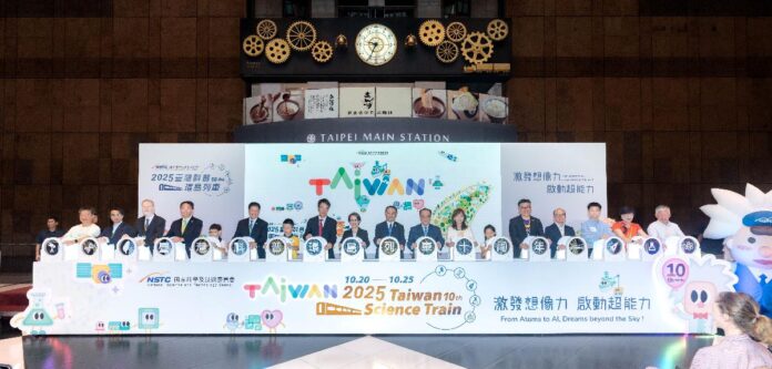 「2025臺灣科普環島列車」今(20)日自臺北車站盛大啟航,展開為期6天的全臺科學之旅。副總統蕭美琴、國科會副主委林法正、數位發展部部長林宜敬、立委郭昱晴、國營臺灣鐵路股份有限公司董事長鄭光遠,以及9家車廂參與單位代表與來自北北基地區的師生齊聚現場,共同為10周年科普列車送上祝福!