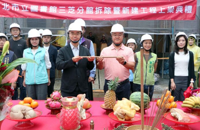 新北市立圖書館三芝分館重建工程,於去年8月開工動土後,整體工程穩定推進,今(20)日舉行上梁儀式,祈求圖書館能在明年下半年順利完工啟用,豐富北海岸的閱讀量能。