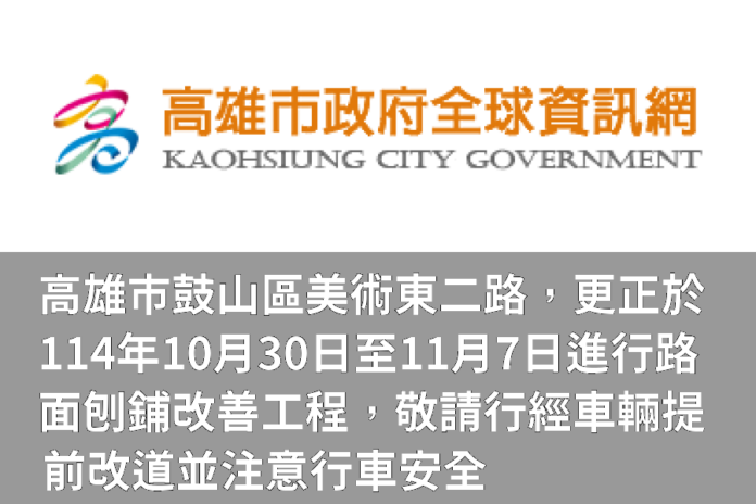 高雄市鼓山區美術東二路,更正於114年10月30日至11月7日進行路面刨鋪改善工程,敬請行經車輛提前改道並注意行車安全