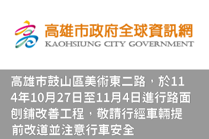 高雄市鼓山區美術東二路,於114年10月27日至11月4日進行路面刨鋪改善工程,敬請行經車輛提前改道並注意行車安全