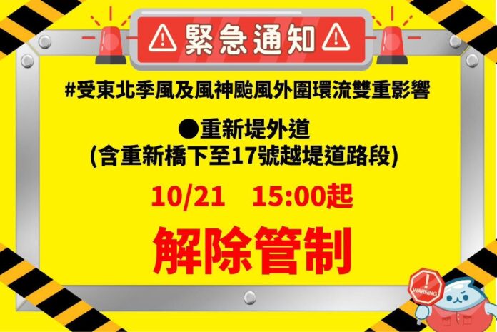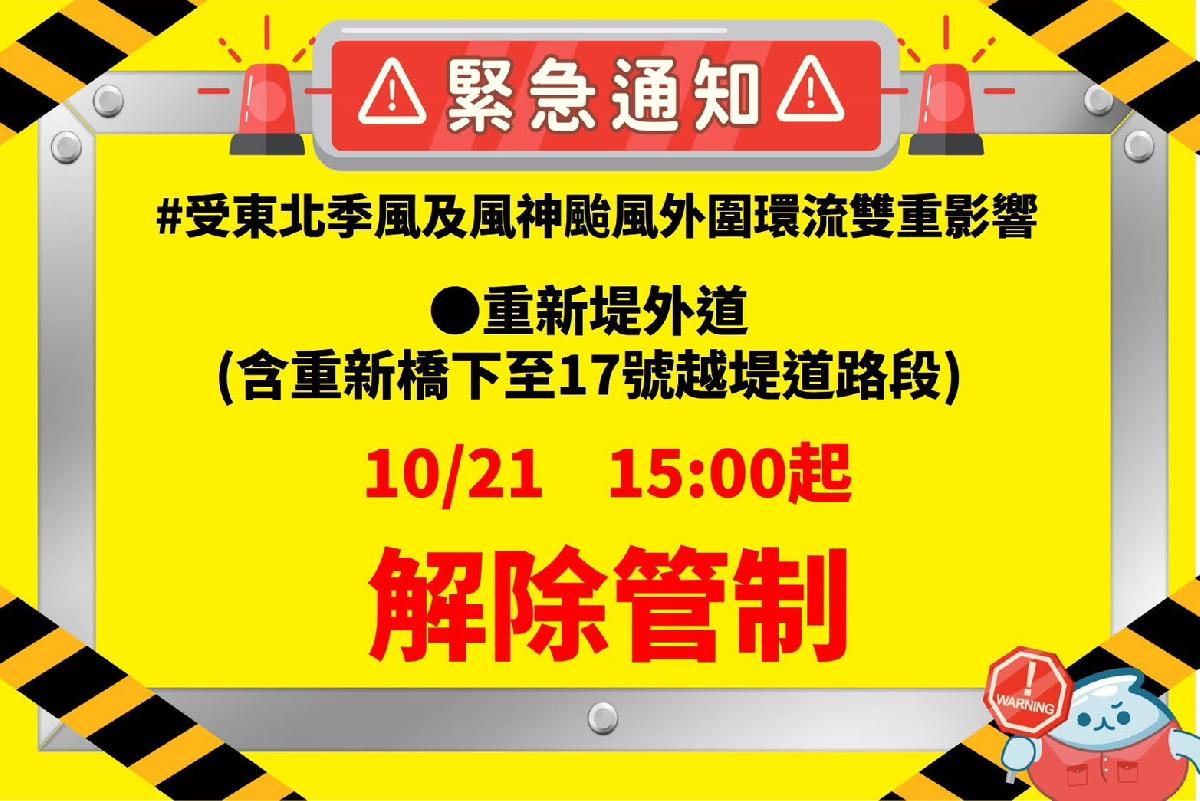 因應東北季風及風神颱風外圍環流共伴效應雨勢趨緩,重新堤外道(重新橋下至17號越堤道)於今(21日)下午15時開放通行,部分水門周邊紅黃線路段亦將恢復管制,請車主於明(22日)上午7時前將車輛駛離,路邊停車位同步恢復收費。