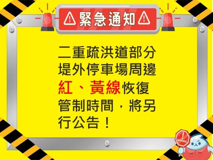 交通局表示,二重疏洪道周邊紅、黃線恢復管制時間將另行發布通知,請市民朋友留意新北市交通局等相關網頁。