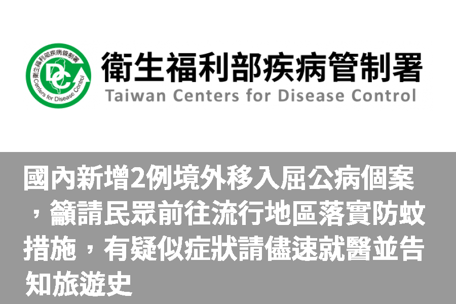 疾病管制署(下稱疾管署)今(21)日表示,國內新增2例屈公病境外移入病例,為本國籍50多歲同住家人,居住於金門縣,今(2025)年10月初至中國廣東省潮州市旅遊,10月7日返回金門,10月9日起陸續出現發燒、關節痛、紅疹等症狀,於10月14日至醫院就診,經採檢送驗後確診。2名個案均已痊癒,將持續監測至11月6日。衛生單位調查發現,個案潛伏期間具中國廣東省旅遊史,研判為中國境外移入個案。個案病毒血症期間主要活動地為其住處,衛生單位已針對個案住處進行病媒蚊密度調查及化學防治等防治工作,同時加強附近居民健康監測,並請當地醫療院所提高通報警覺。