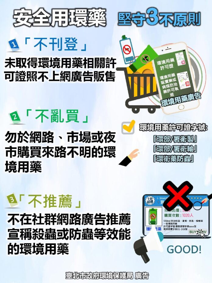 環保局提醒,民眾及業者於網路刊登或販售環境用藥時,應遵守「3不原則」: