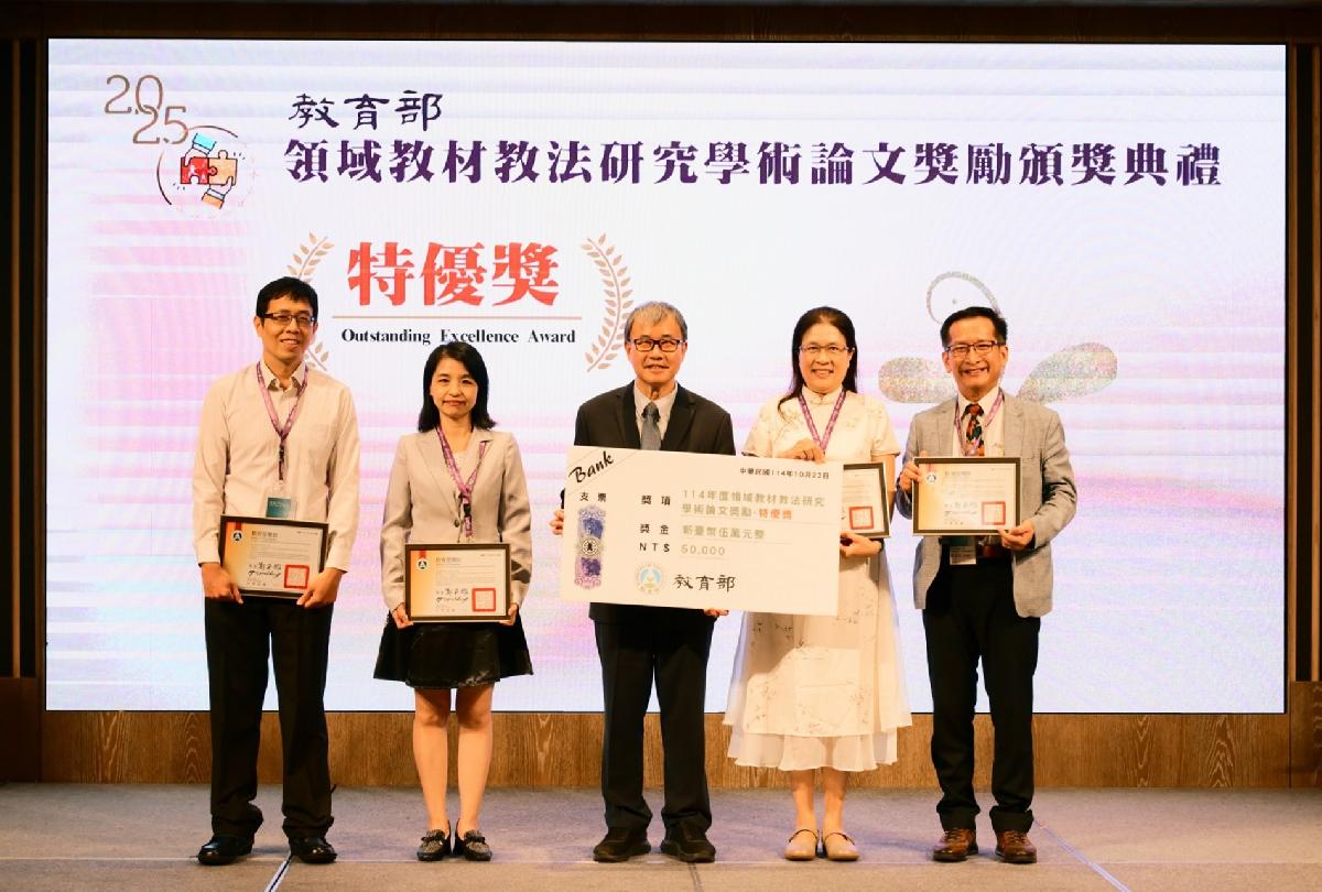 鄭部長於頒獎時肯定得獎學者們的努力,本次得獎論文更深刻呼應了當前教育的兩大趨勢:數位創新與跨域統整,無論是探討AI導入教學或VR與課程結合、文化深耕、桌遊融入社會情緒學習,乃至於雙語自然教材的開發,每一篇都從不同角度,為我們未來的教師蓄積了數位力、創新力與專業力,這些研究兼具「學術創新」與「實務價值」,不僅推進教材教法的專業發展,更實際回饋教學現場,讓未來的教師能以更全面、更靈活的方式引導學習。