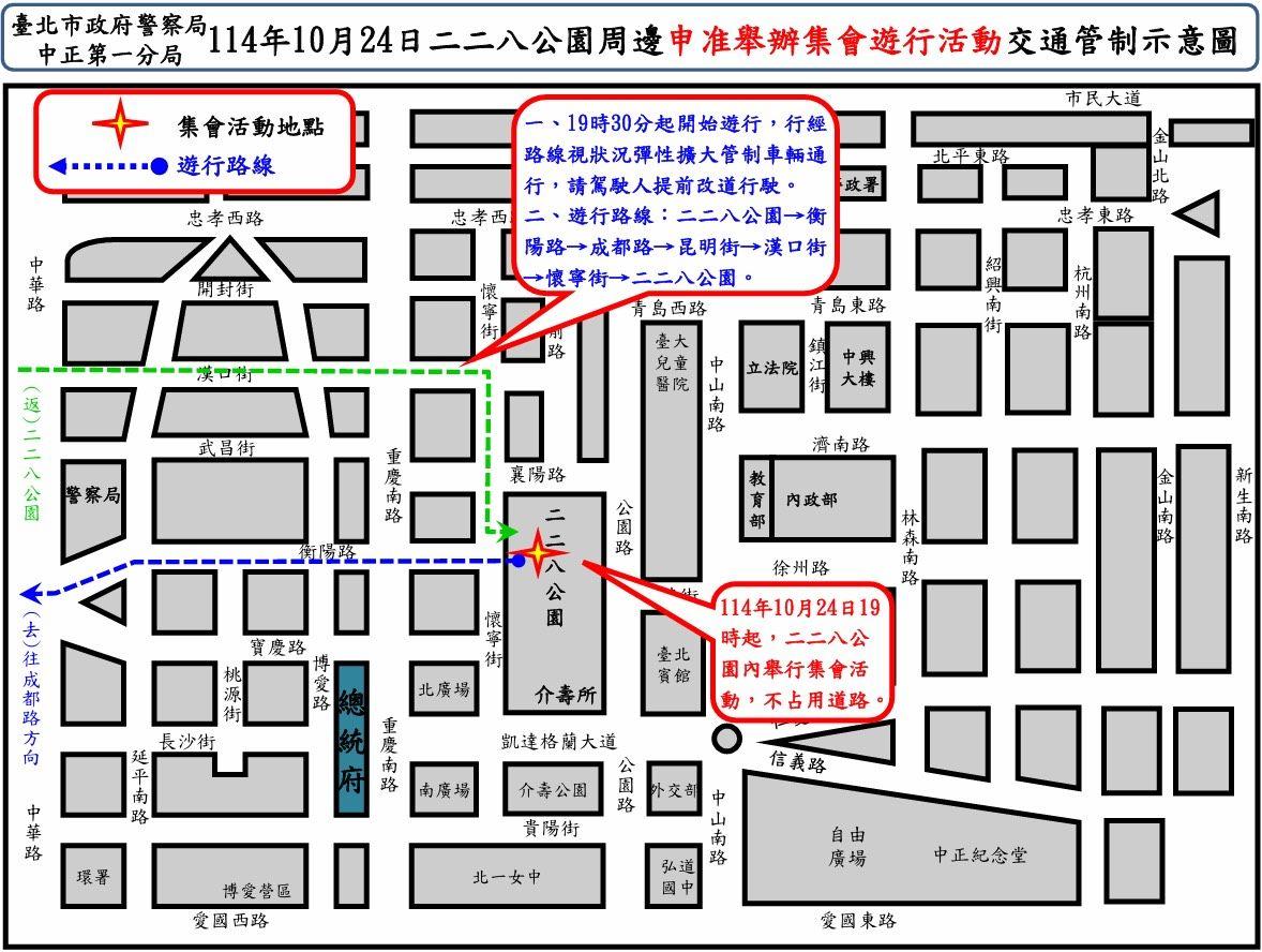 為維護前揭活動交通秩序與安全,中正第一分局業規劃交通疏導管制勤務,本次集會地點及遊行路線說明如下:
