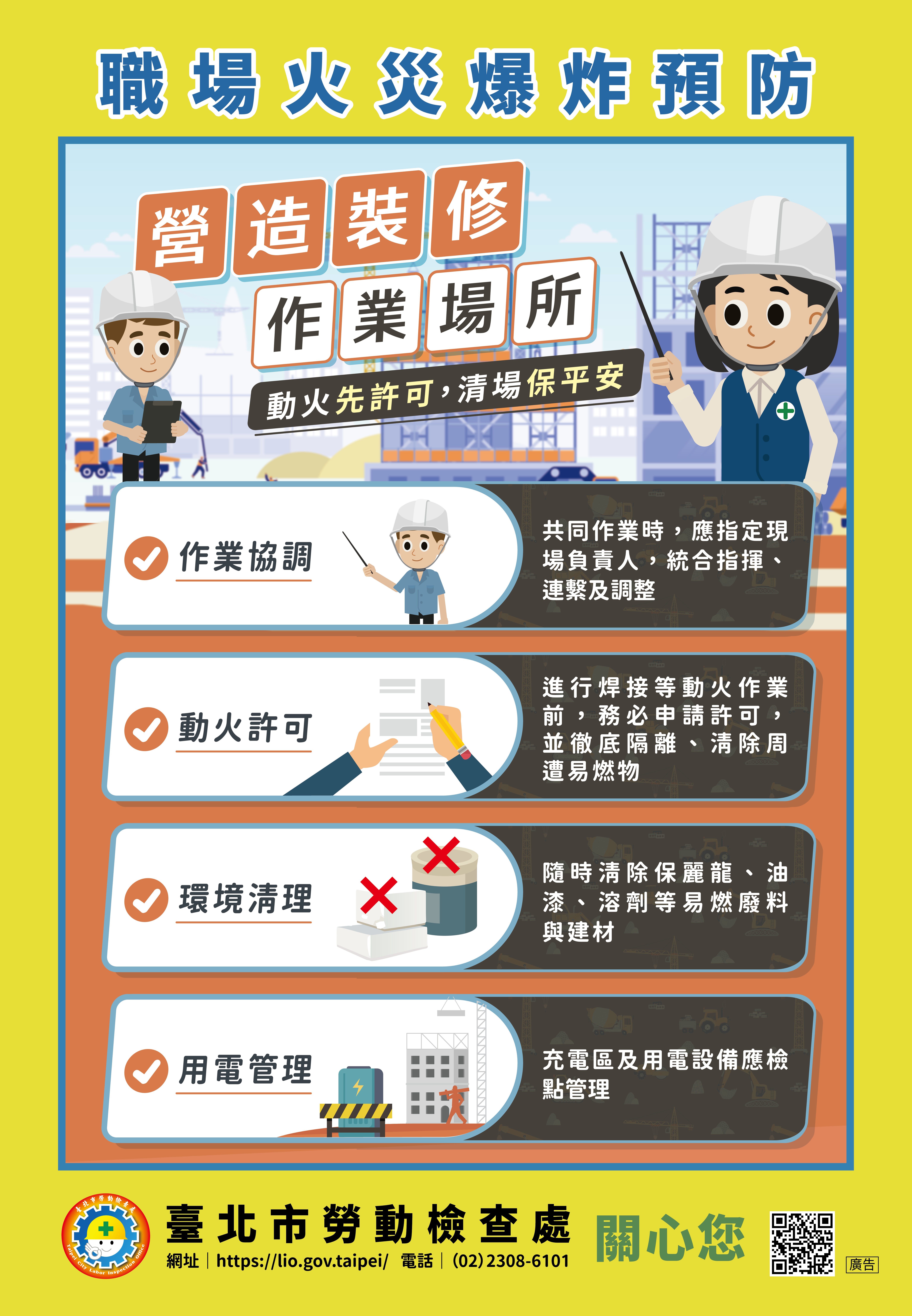 近年來,工作場所中發生的火災與爆炸意外頻傳,造成嚴重的勞工傷亡與財產損失。看似微不足道的疏忽,往往成為災害的導火線。為了強化勞工與雇主預防職場火災爆炸之職業安全衛生知識,臺北市勞動檢查處於今日上午發表114年度職業安全衛生數位教材-「防患未燃:揭開職場火災爆炸的危機引線」。旨在透過淺顯易懂及有趣的動畫方式,推動職業安全衛生防災教育,避免工作場所火苗的產生。期許勞工朋友能從源頭辨識風險,進而內化成日常行動。
