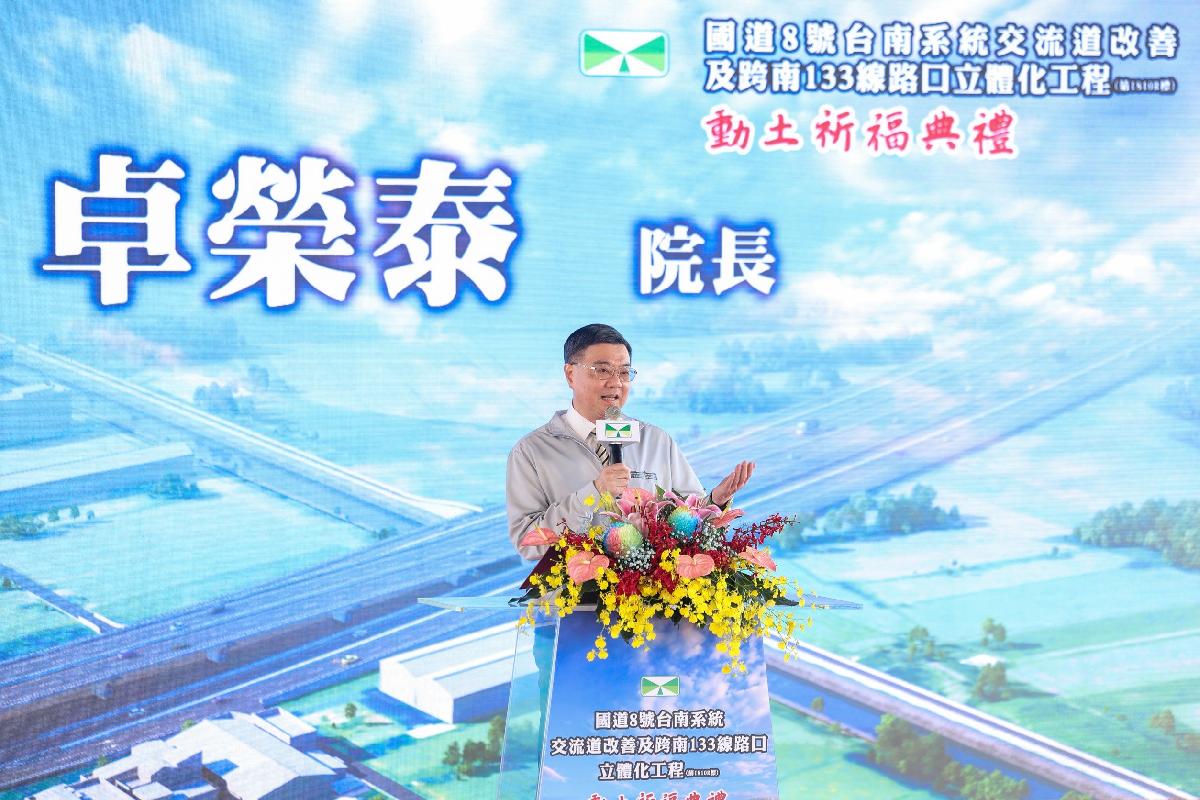 行政院長卓榮泰今(24)日前往臺南市出席「國道8號台南系統交流道改善及跨南133路口立體化工程」動土祈福典禮時表示,國道8號與南133線路口是國8唯一設置紅綠燈的平交路口,為改善此交通瓶頸,在行政院蘇貞昌前院長任內,核定可行性研究報告,陳建仁前院長接續核定建設計畫,使今日得以順利開工。卓院長強調,這絕不是「前人種樹、後人乘涼」,而是「前人種樹,後人讓樹更茁壯」,期盼設計監造單位「台灣世曦工程公司」及施工廠商全力以赴,如期如質在2030年完工,成為臺南邁向下一階段的重要里程碑。卓院長進一步指出,除推動國道立體化外,行政院於今(2025)年9月核定「臺南鐵路立體化延伸至永康地區可行性評估研究」,將改建大橋、永康兩車站為地下化車站,並於10月核定「臺南市先進運輸(大眾捷運)系統第一期藍線建設及周邊土地開發計畫綜合規劃報告書」,未來將以「高速公路立體化、鐵路地下化、捷運便捷化」三線並進,完善臺南交通建設,讓臺南成為更進步的城市。為實現「均衡臺灣」目標,卓院長表示,政府積極推動「六大區域產業及生活圈計畫」,其中「大南方新矽谷」,將以沙崙為核心,結合智慧綠能科學城、生態科學園區與創新大樓,形塑半導體S廊帶,帶動高屏產業聚落與國際投資。同時,政府將於全國各地推動152項重要基礎建設,而交通是打通地方發展任督二脈的關鍵,期盼以沙崙為起點,打通交通瓶頸,順利帶動大臺南地區產業發展,也希望地方議會與里長共同支持相關工程推動,讓地方建設儘速完成。卓院長表示,今年7月丹娜絲颱風及七二八豪雨造成臺南地區嚴重傷害,賴清德總統一再指示要加大復原力道、加快復原速度,因此行政院於今年8月提出「丹娜絲颱風及七二八豪雨災後復原重建特別條例」,後續因應花蓮馬太鞍溪堰塞湖災情,亦提出特別條例修正案,他也會再與主計總處研議相關預算,讓資源能夠馬上到位,給予臺南鄉親更多協助,除了加速重整家園,也讓建設與復原並行。卓院長也肯定交通部陳世凱部長不僅深入了解地方交通問題,更勇於解決問題。此外,郭國文立委、陳亭妃立委、王定宇立委、賴惠員立委及林俊憲立委,長期就臺南地方交通建設、停車設施及颱風災後復原等議題,為鄉親發聲、爭取地方建設,中央已編列復原重建特別預算,將全力協助臺南災區加速復原。此行,卓院長先聽取交通部高速公路局陳文瑞局長說明「國道8號台南系統交流道改善及跨南133線路口立體化工程」簡報,瞭解工程背景及效益;致詞結束後,偕同行政院李慧芝發言人、交通部陳世凱部長、行政院雲嘉南聯合服務中心李碧菁副執行長、交通部高公局陳文瑞局長、王定宇立委、郭國文立委、陳亭妃立委、賴惠員立委、臺南市趙卿惠副市長等人進行祈福儀式,上香祈求工程順利,並執金鏟起鍬三鏟,完成動土儀式。