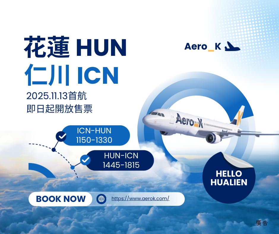 2025年11月13日,由韓國可依航空 Aero K Airlines 正式開航「仁川 ICN ✈ 花蓮 HUN」航班!