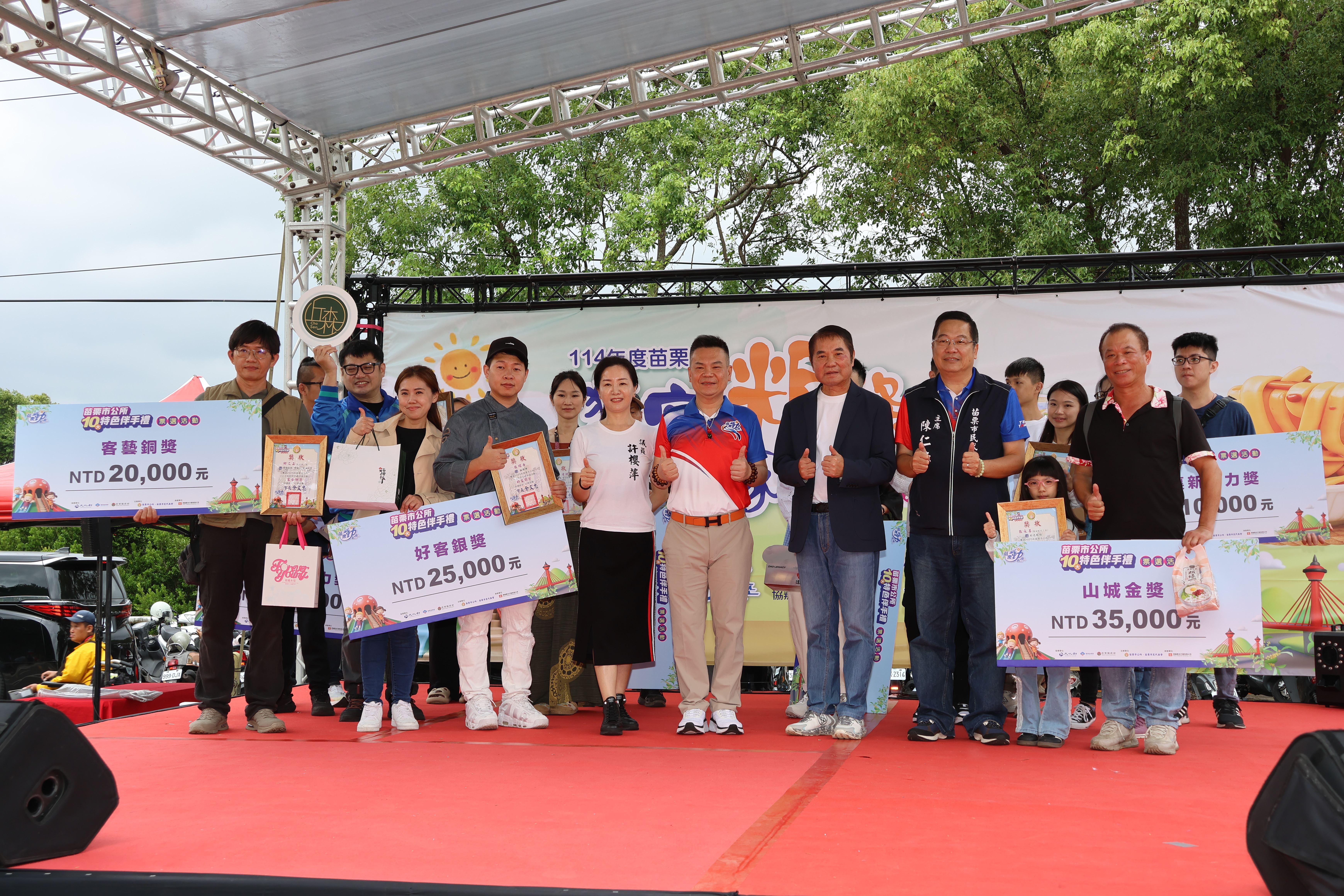 其中,苗栗市十大特色手禮票選活動,以「茶、粄、陶、染」為主題,邀請在地工藝師、農產業者及創作者共同參與,挖掘兼具地方特色與市場潛力的優質伴手禮,活動設有「山城金獎」、「好客銀獎」、「客藝銅獎」及「貓裏新潛力獎」等獎項,總獎金高達15萬元。