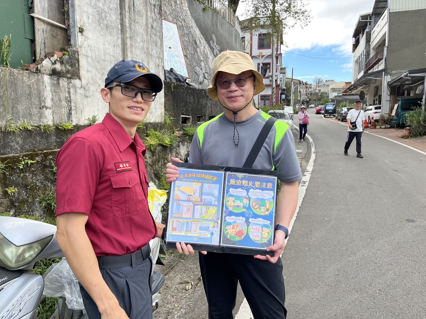 消防人員透過宣導看板,向居民說明住警器使用注意事項及爆竹煙火燃放安全規定。住警器應具內政部登錄機構認可之合格標示,其中常見的偵煙式住警器能於偵測到濃煙時即發出警報,提醒住戶及早避難逃生。