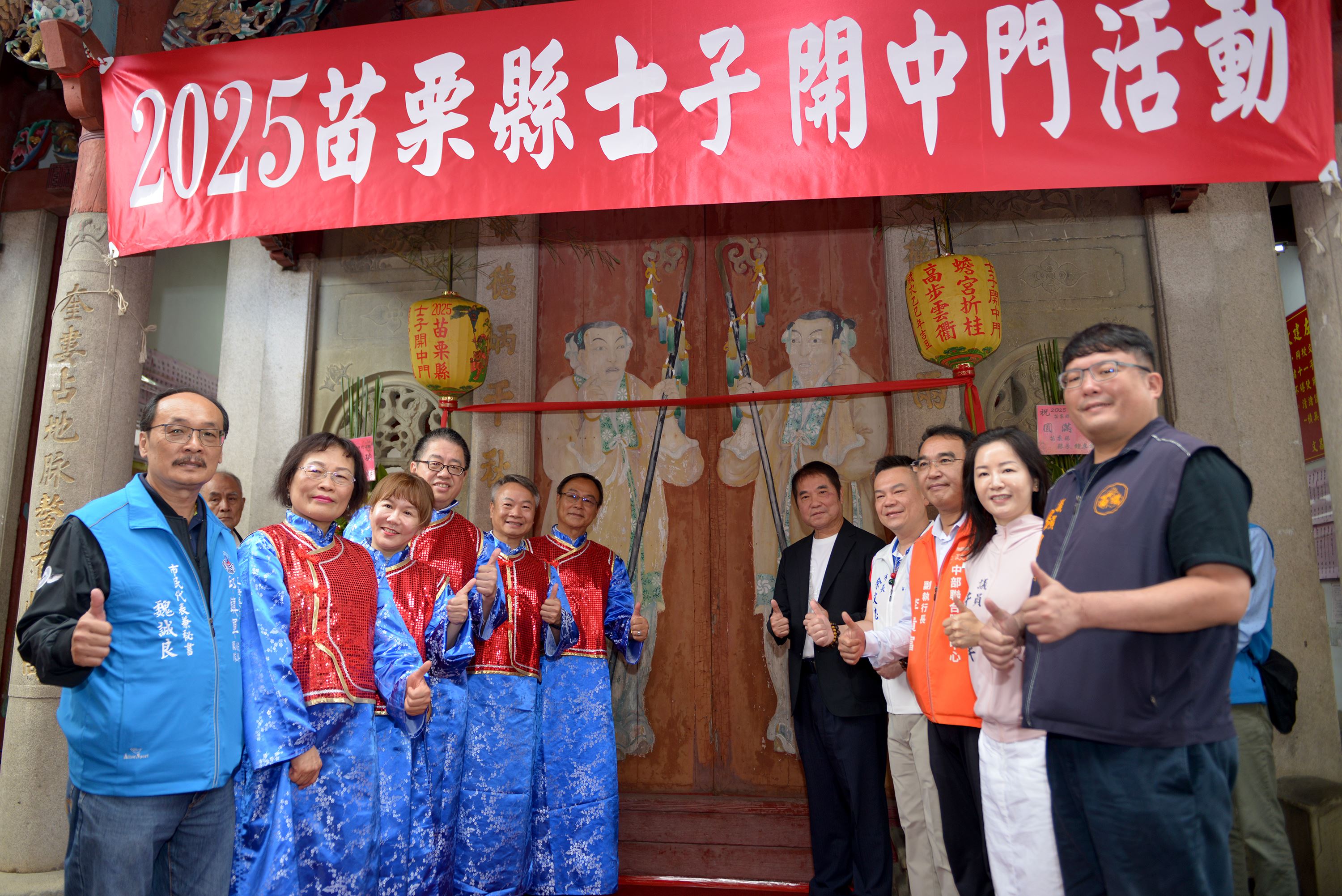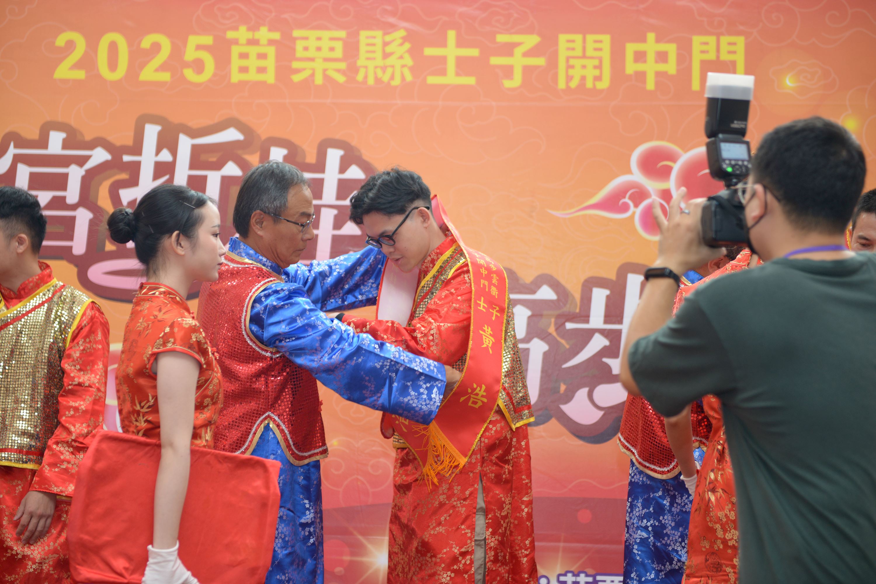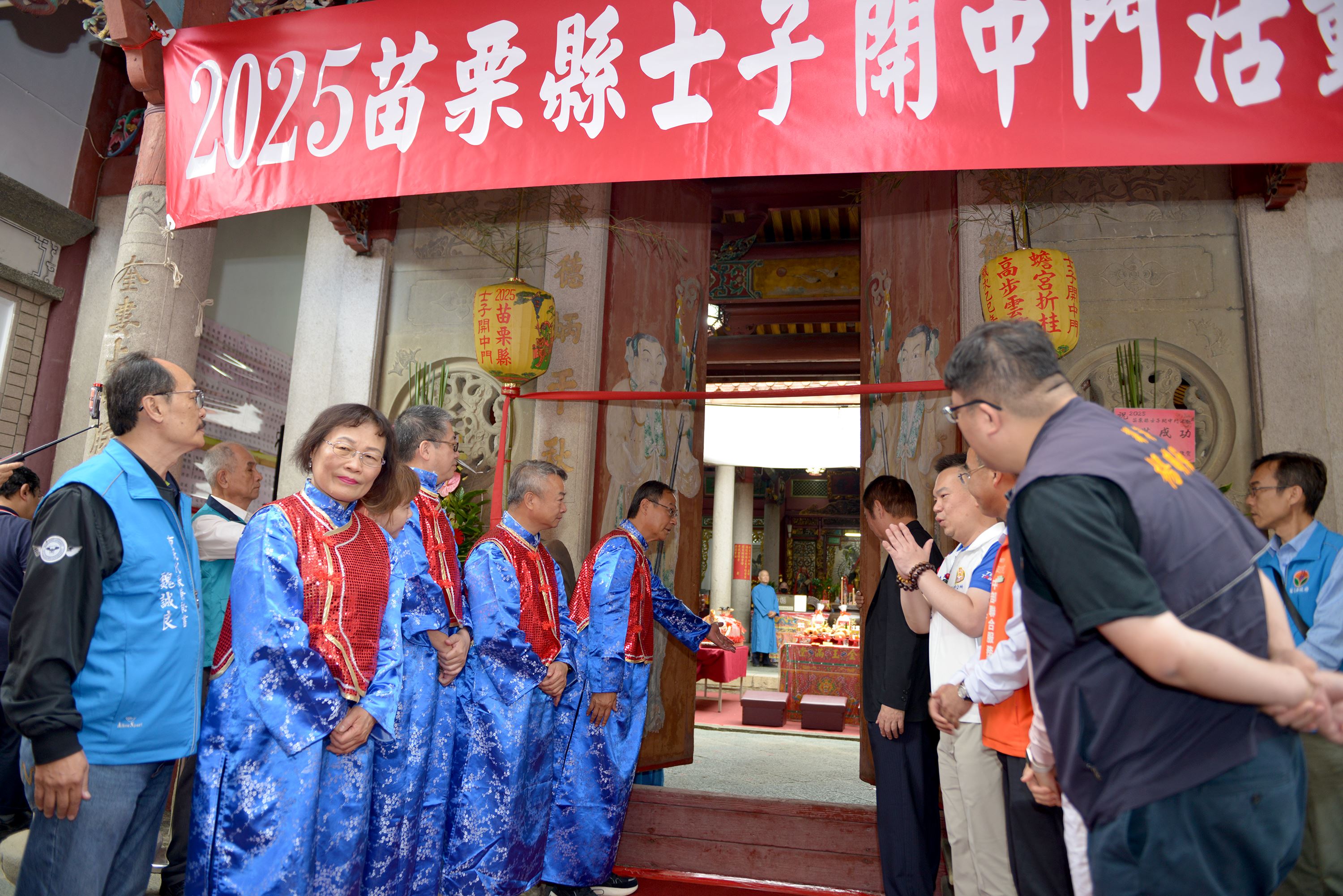 苗栗縣政府為弘揚崇文重道精神、嘉勉學子奮發向上,10月25日上午在苗栗市文昌祠舉辦「2025苗栗士子開中門」活動,10位博士及20位高考及格的士子披紅挂綵,循古禮「開中門」祭聖,感受光耀門楣的榮譽,藉此鼓勵青年奮發向學之志。苗栗縣長鍾東錦也到場恭賀各位士子,並宣布地方特考明年開始在苗栗設考場,嘉惠本縣考生。