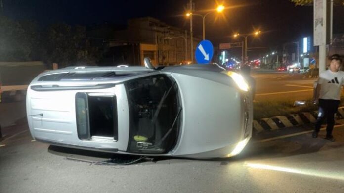 通霄分隊昨日晚間接獲指揮中心通報轄內五南里發生一起車禍,通霄分隊立即出動救護及救助人員前往現場,現場發現為一台自小客車因不明原因自撞分隔島翻覆,所幸無人員受困。