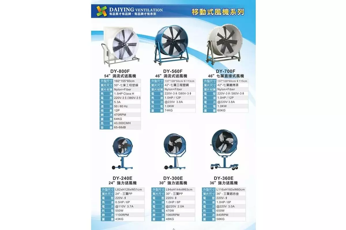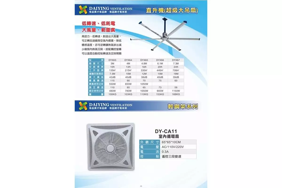 – 風扇系列:負壓風扇、正壓風扇、工業風扇、大型通風扇、靜音風扇、超大型吊扇(直升機大吊扇)。