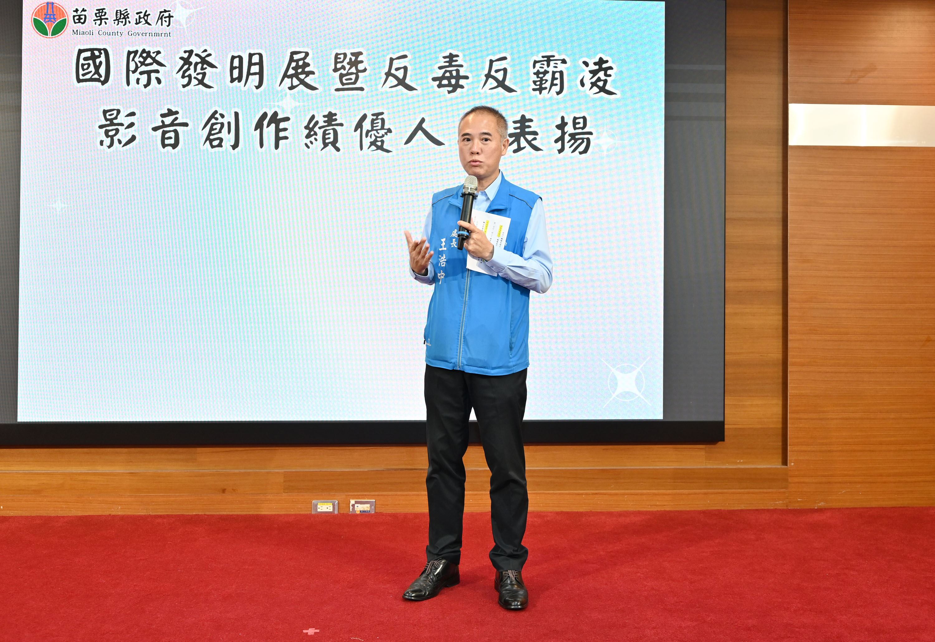 苗栗縣政府今天在第一辦公大樓A201會議室舉辦國際發明展暨反毒反霸凌影音創作績優人員表揚,共有39位師生受獎。縣長鍾東錦除頒發獎學金及獎狀讚揚他們是「苗栗之光」,也鼓勵選手們持續精進,努力發揮創意巧思,再締佳績,為苗栗爭光。