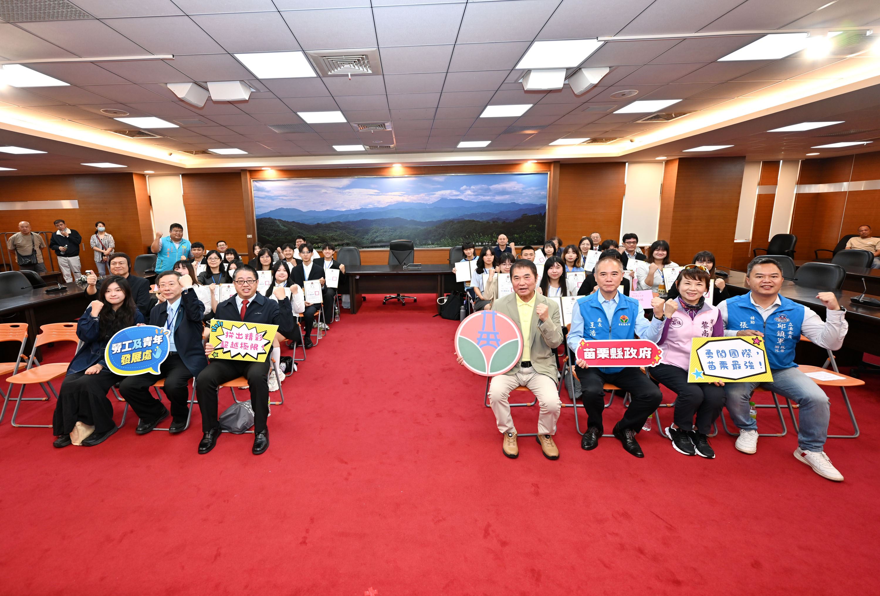 縣長鍾東錦、勞工及青年發展處長王浩中、立委邱鎮軍特助張朋輝、議員黎尚安、救國團苗栗縣團委會總幹事廖啟豪上午一一頒獎恭喜得獎師生,仁德醫專校長黃柏翔、聯大校長侯帝光、苗商組長杜云耘也到場與學校師生分享榮耀。