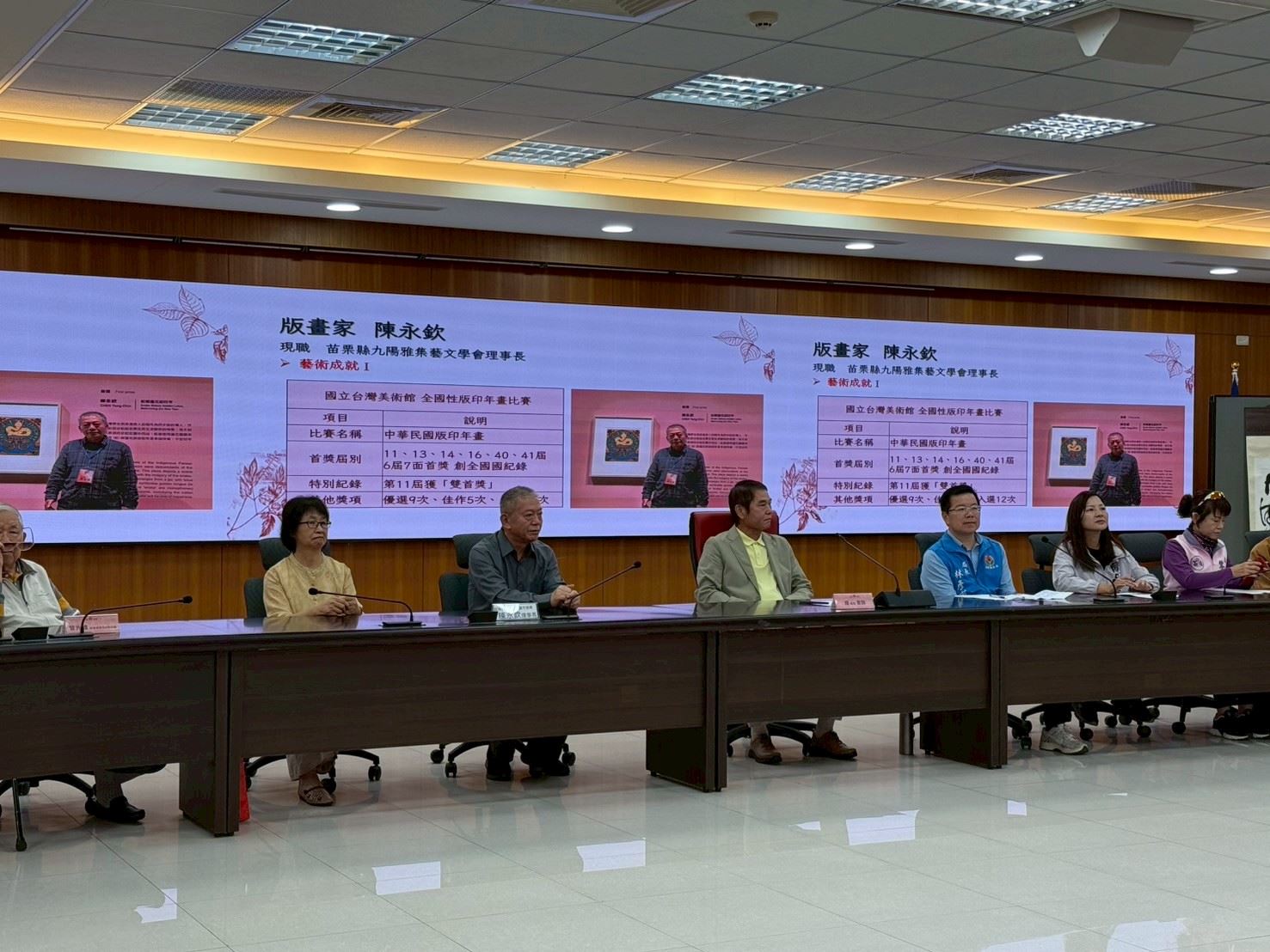 陳老師對版畫媒材掌握純熟,運用多版套印與色彩疊印技法,在畫面中營造豐富光影與層次,同時展現木刻的厚實與絹印的細膩,使作品兼具手工溫度與視覺張力。陳老師也曾多次入選全省美展、新竹美展及國際版畫雙年展,作品亦典藏於國立台灣美術館。陳永欽目前為現任九陽雅集藝文學會理事長,他感謝苗栗縣府長期對藝術創作的支持,並表示:「我會持續創作,將台灣年畫推向更多國際舞台,讓傳統藝術在現代社會中繼續發光。」