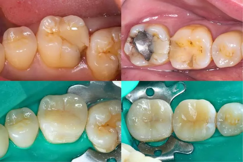 傳統樹脂填補下二次蛀牙並造成牙冠斷裂(左上)陶瓷嵌體修復後(左下)