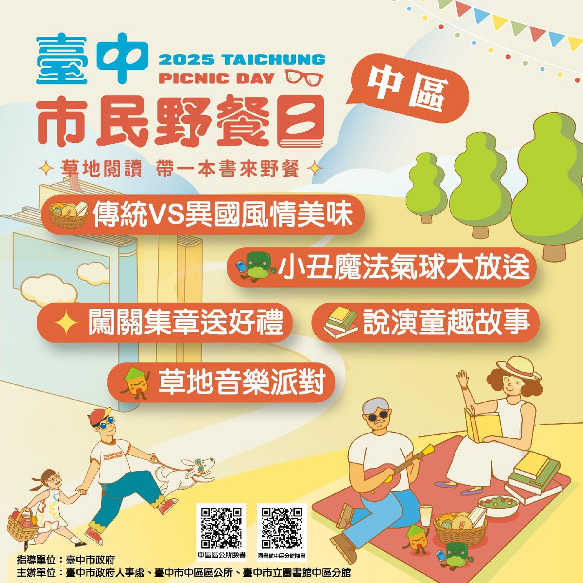 「2025台中市民野餐日」將於11月2日(星期日)盛大登場!今年呼應「台中綠美圖」試營運,以「草地閱讀」為主題,於全市29個行政區同步舉行;中區場次在台中公園(近平等街口)熱閙展開。活動由台中市政府人事處及中區區公所主辦,市立圖書館中區分館協辦,以閱讀為核心,結合中區舊城文化與新住民特色,打造一場以「新舊多元文化,讀見彼此」為主軸的戶外盛會,邀請市民攜家帶眷、呼朋引伴在綠意與陽光中,享受閱讀與交流的美好時光。