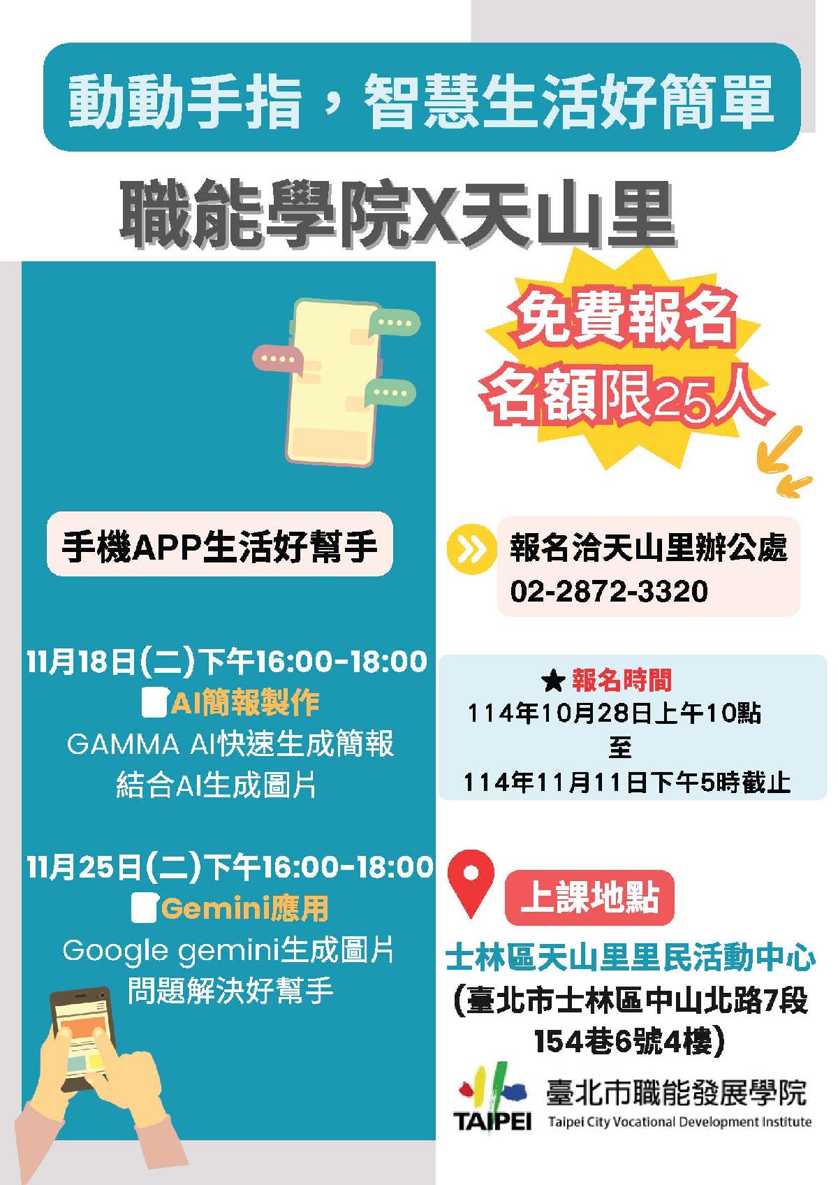 課程預計於114年11月18日及25日開課,報名期間自114年10月28日至11月11日止,凡對手機應用與數位生活有興趣的民眾皆可向當地里辦公室報名參加。