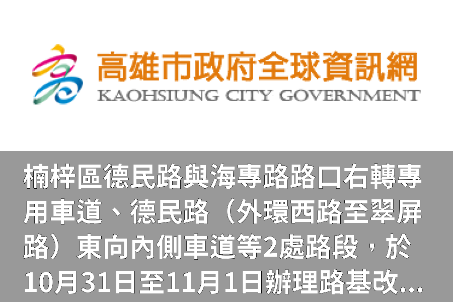 為改善高雄市道路通行品質,工務局道路養護工程處將於114年10月31日至11月1日晚間9時至上午8時,於夜間施工辦理楠梓區德民路與海專路路口右轉專用車道、德民路(外環西路至翠屏路)東向內側車道等2處路段辦理路基改良改善工程,如遇天候不佳,將順延一天進場施工。