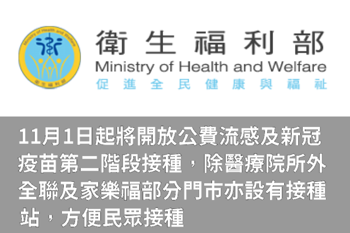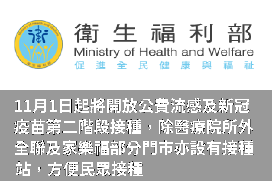 疾病管制署(下稱疾管署)今(28)日表示,今(114)年度公費流感及新冠疫苗將於11月1日開放第二階段接種,50至64歲無高風險慢性病成人等公費對象可前往施打。另11月1日起,全臺各地之全聯、大全聯(共約120家門市)及家樂福(約32家門市)亦將擇日設置疫苗接種站,更方便民眾接種疫苗,完成接種者還可獲得門市準備之健康好禮(詳細設站地點、日期及禮物品項依門市公布為準)。