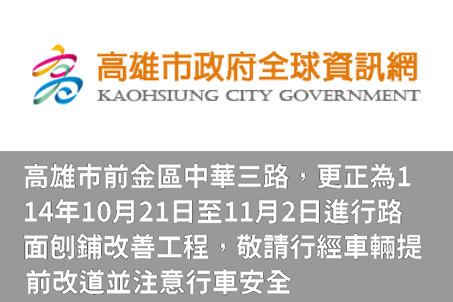 為改善高雄市道路通行品質,工務局道路養護工程處原訂10月21日至29日進行前金區中華三路(青年二路至河南二路)路面刨鋪工程,因故更正延長為10月21日至11月2日辦理,施工時段晚間9時至隔日晨間6時,另為顧及工程品質,刨鋪後均依施工規範封閉養護6小時以上或溫度降低至50°C以下始開放通車,確保道路使用壽命及品質,如遇天候不佳,將順延一天進場施工。