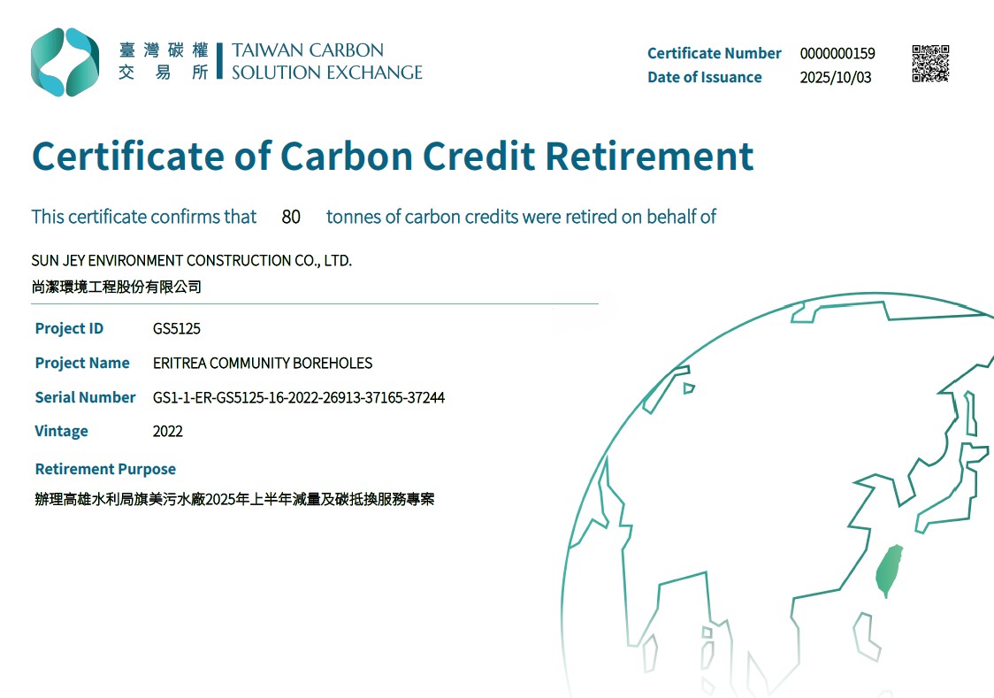 透過設備改善減量,節能與設備改善工程(包含汰換為小馬力鼓風機、小馬力抽水泵等),2025 年 1~6 月的二氧化碳排放量相較 2024年同期相比,由 316 噸降至 183 噸,減排效果顯著。此外透過綠電憑證抵換,由水利局在中區污水處理廠建置太陽能板所取得之 217張綠電憑證,用以折抵部分二氧化碳碳排放量。針對剩餘排放部分,另行購買外部碳權 80 噸抵減剩餘排放量,以進一步達成碳排放抵減目標。