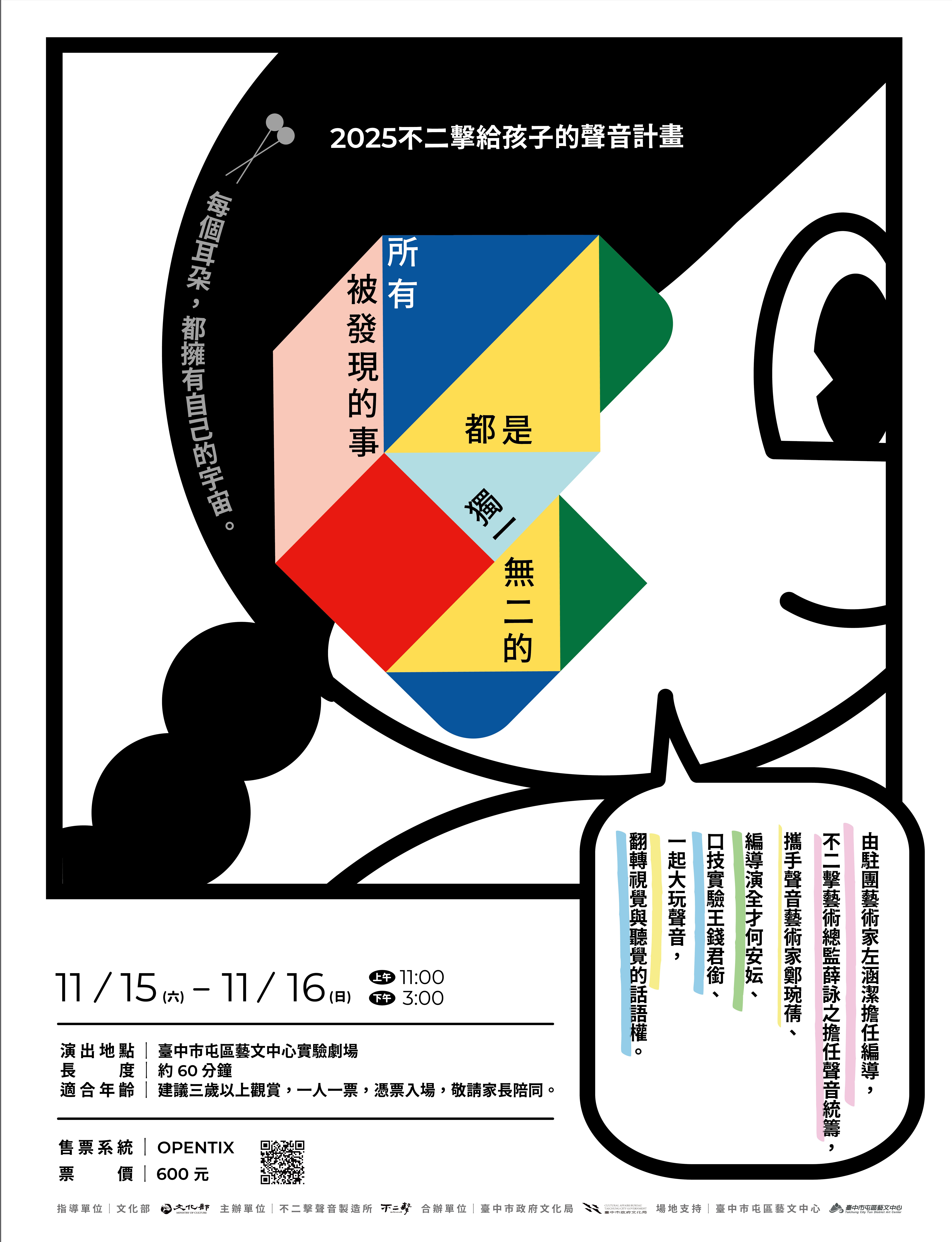 台中市屯區藝文中心駐館團隊「不二擊聲音製造所」將於11月15、16日在實驗劇場推出壓箱製作《所有被發現的事情都是獨一無二的》,這檔為全新專為孩子打造的聲音劇場,邀請大小朋友打開耳朵、放鬆視覺,專注體驗聲音,帶領觀眾展開一場耳朵奇遇。現正提供四人同行優惠,歡迎親子一同入座,讓耳朵成為主角,伴隨想像力與創造力自由奔跑。