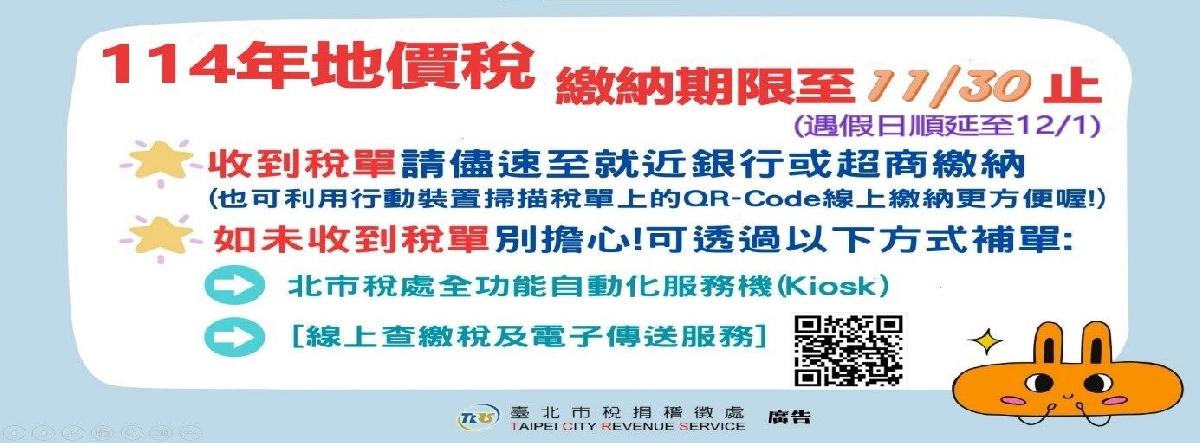 臺北市稅捐處表示,今(114)年地價稅將於11月1日開徵,繳款書已陸續寄發,繳納期限至11月30日(因遇例假日順延至12月1日)止,課稅所屬期間114年1月1日至12月31日;依土地稅法規定,地價稅納稅義務人為8月31日地政機關土地登記簿所載之所有權人,因以總歸戶合併計算稅額,所以每位土地所有權人在本市不論有幾筆土地僅會收到一張地價稅繳款書。