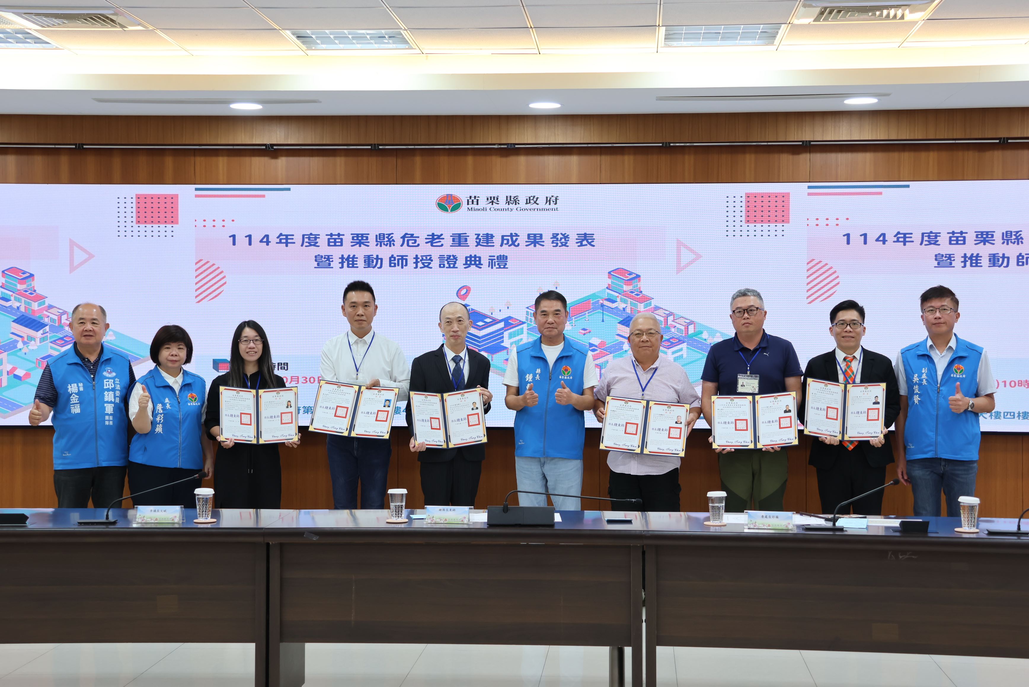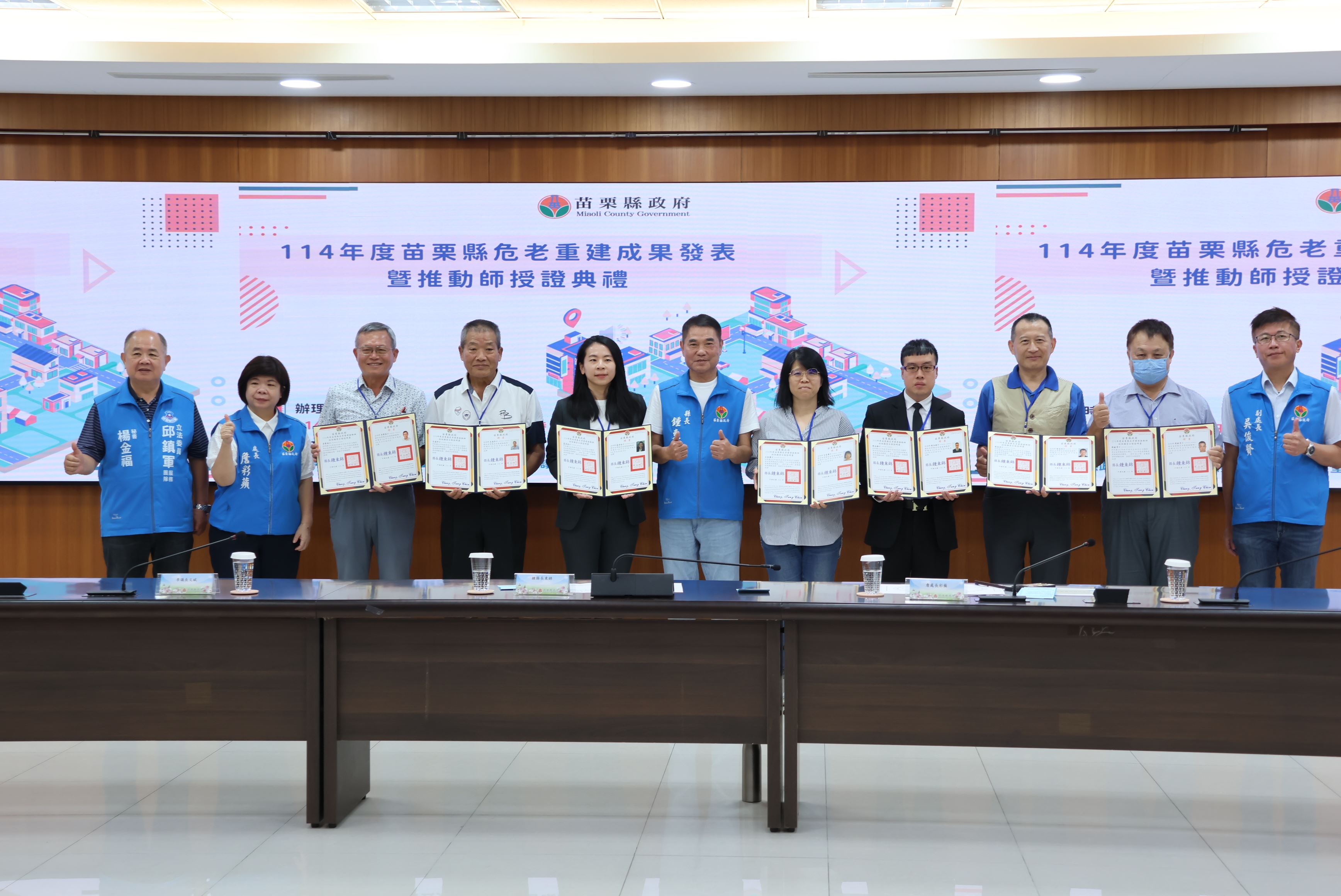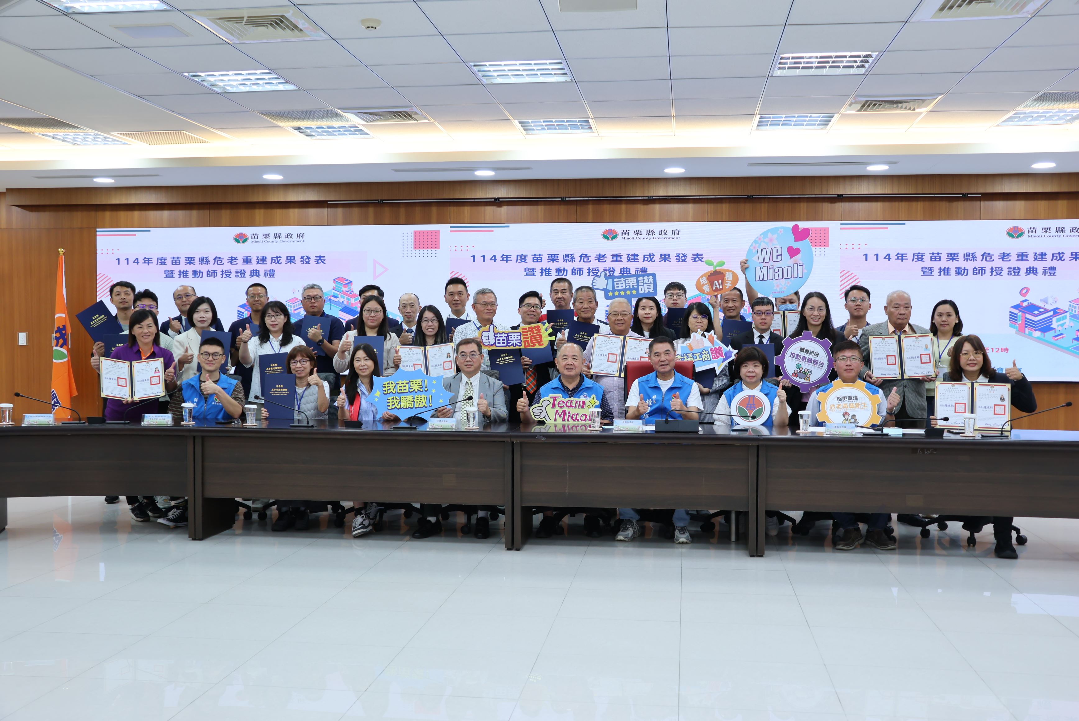 苗栗縣政府積極推動的危險老舊住宅重建工作,與台北市為全國唯二推行危老推動師制度的縣市,10月30日苗栗縣長鍾東錦頒發43名危老重建推動師證書,將進一步強化專業輔導,協助各鄉鎮推動危老住宅重建案,提高居住空間與品質,縣府將持續推動危老重建相關政策,攜手打造幸福苗栗。