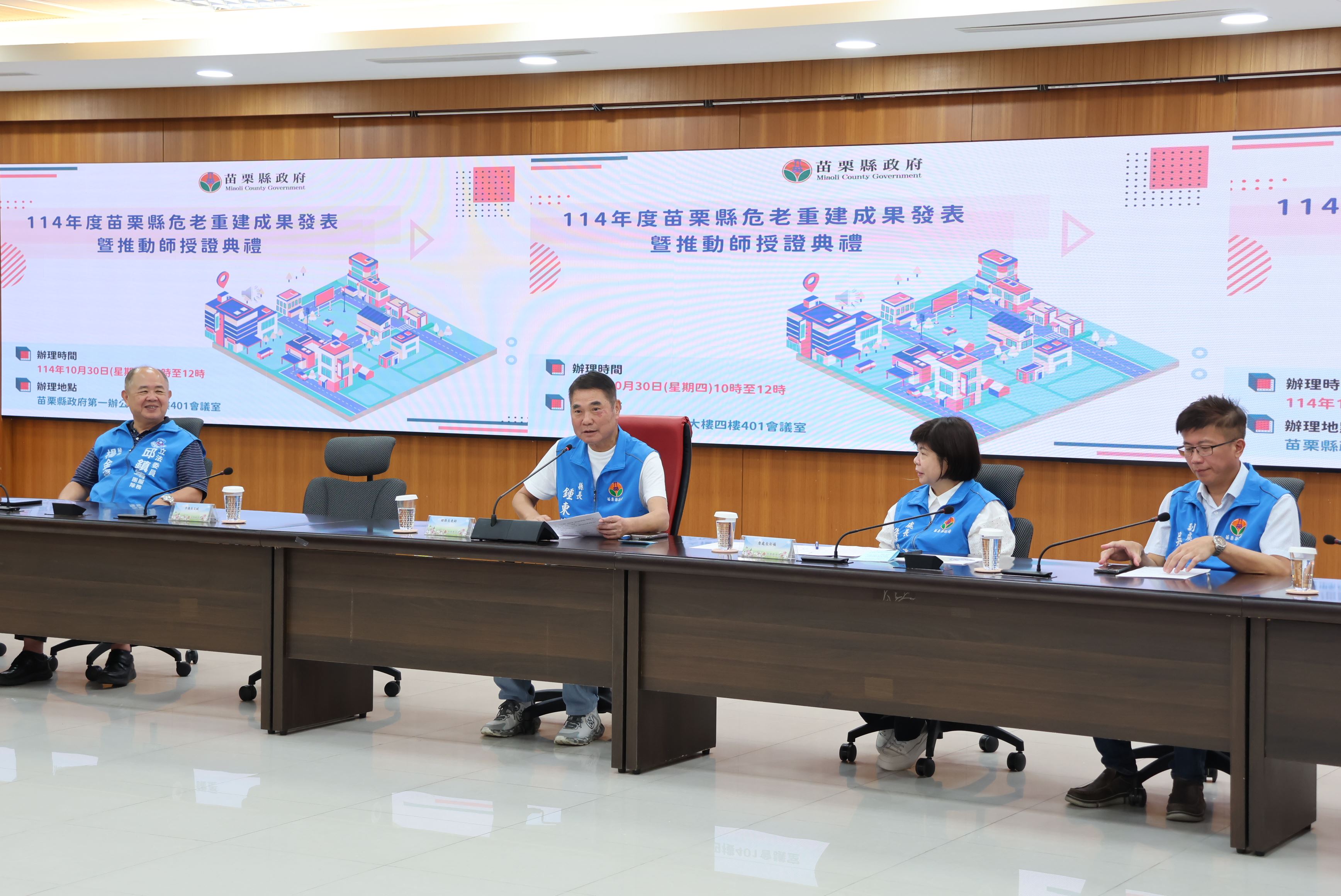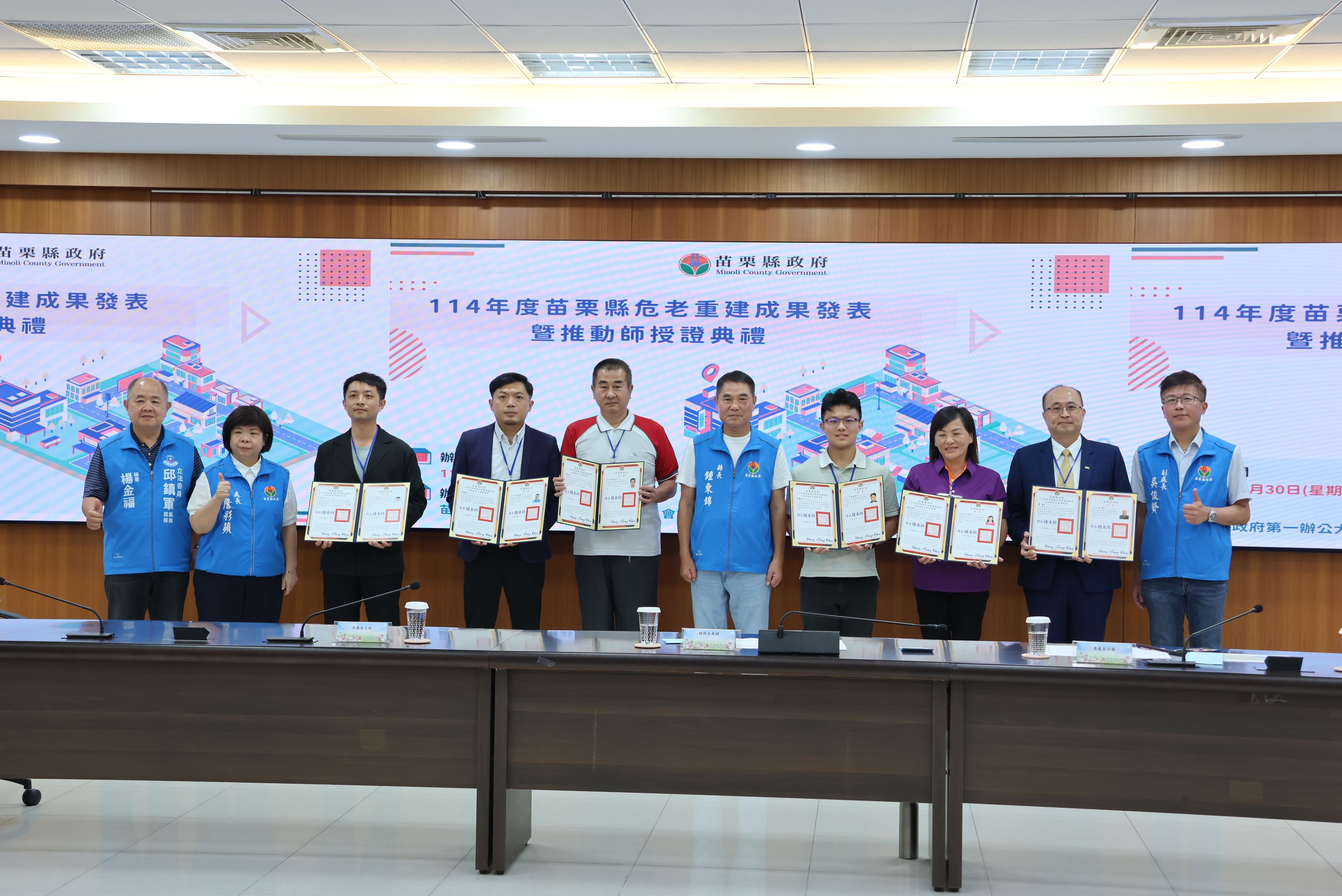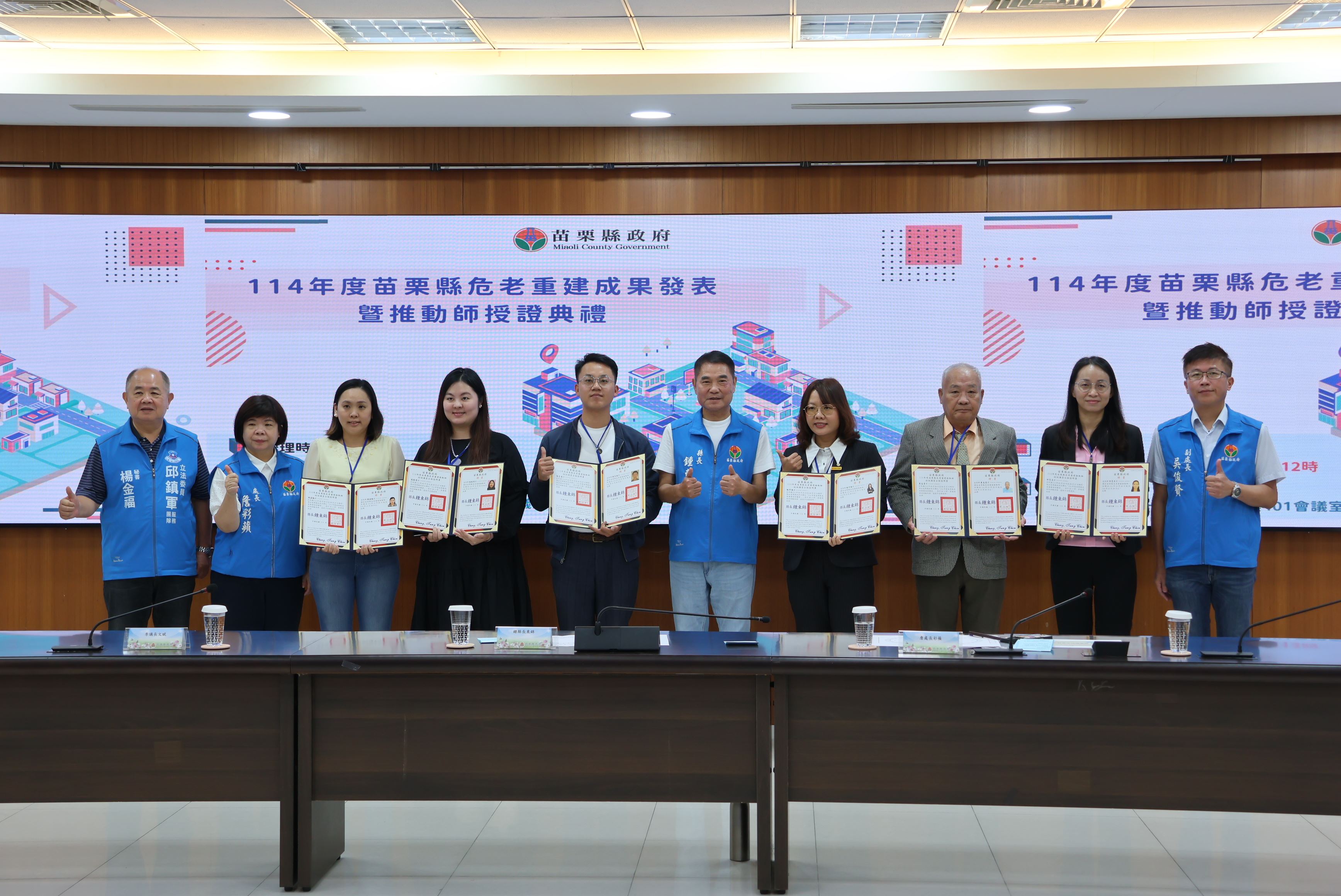 苗栗縣政府積極推動的危險老舊住宅重建工作,與台北市為全國唯二推行危老推動師制度的縣市,10月30日苗栗縣長鍾東錦頒發43名危老重建推動師證書,將進一步強化專業輔導,協助各鄉鎮推動危老住宅重建案,提高居住空間與品質,縣府將持續推動危老重建相關政策,攜手打造幸福苗栗。