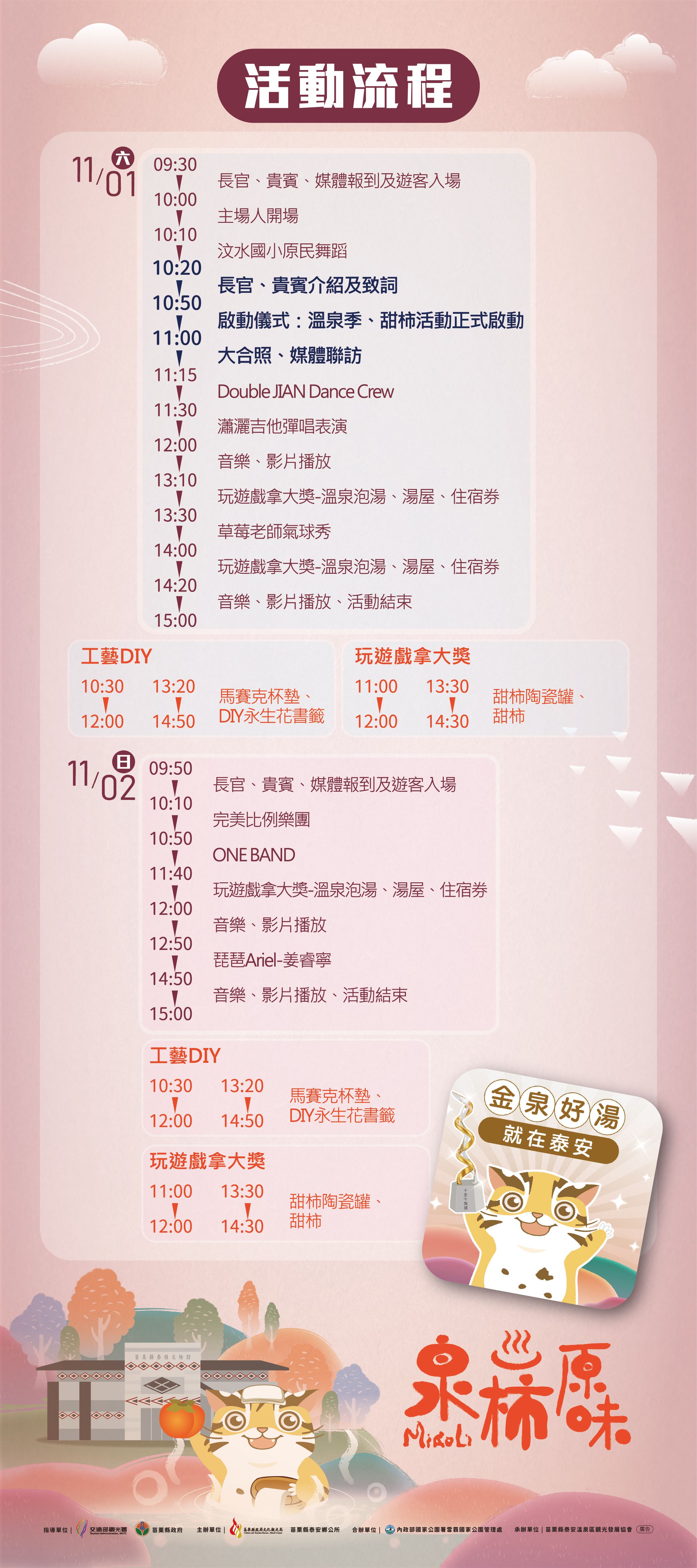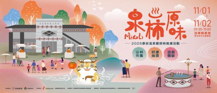 文化觀光局長林彥甫表示,活動會場以山林、草地音樂晚會概念布置,邀請汶水國小原民舞蹈、Double JIAN Dance Crew熱舞、吉他彈唱、氣球秀、樂團及琵琶演出輪番上陣演出,除了欣賞表演和逛市集外,現場發放1,000張百元抵用券(於活動現場、部落市集、清安豆腐街抵用),與民眾互動的【玩遊戲拿大獎】-獎品豐富遊戲闖關後可獲得甜柿、甜柿陶瓷罐、手機支架便當盒,以及泰安溫泉飯店提供的住宿券、湯屋、大眾池泡湯券等多項好禮;除此之外,結合泰安各溫泉飯店,推出住柿大吉-【溫泉住宿│我送甜柿造型陶瓷罐】,活動自114年10月31日起至泰安任一合法溫泉飯店住宿,即贈送泰安甜柿或甜柿造型陶罐,數量有限,送完為止,此外,為推廣泰安甜柿,溫泉飯店現場更備有香脆甜美、風味絕佳的泰安甜柿禮盒供民眾購買、品嘗。