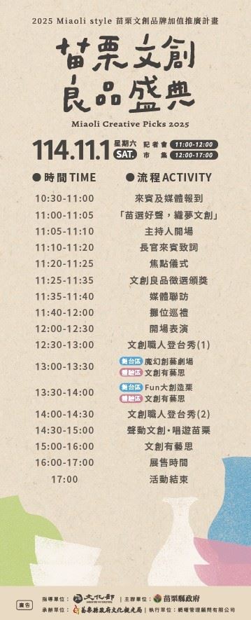 苗栗縣政府為持續培育縣內文化創意產業,啟動「Miaoli style 苗栗文創品牌加值推廣計畫」,以徵選機制挖掘在地優質文創商品,並透過品牌化行銷共同推廣,提升苗栗文創產業的整體能量。歷經評選作業,最終甄選出20組年度「十大文創商品」與「優選作品」,並於114年11月1日(星期六)假尚順育樂世界空橋下廣場舉辦「苗栗文創良品盛典暨形象展覽」,透過典禮與展出,推動文化創意精神,展現苗栗生活工藝之美。