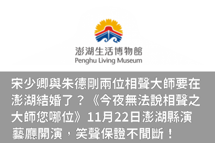 科學教育宋少卿與朱德剛兩位相聲大師要在澎湖結婚了?《今夜無法說相聲之大師您哪位》11月22日澎湖縣演藝廳開演,笑聲保證不間斷!