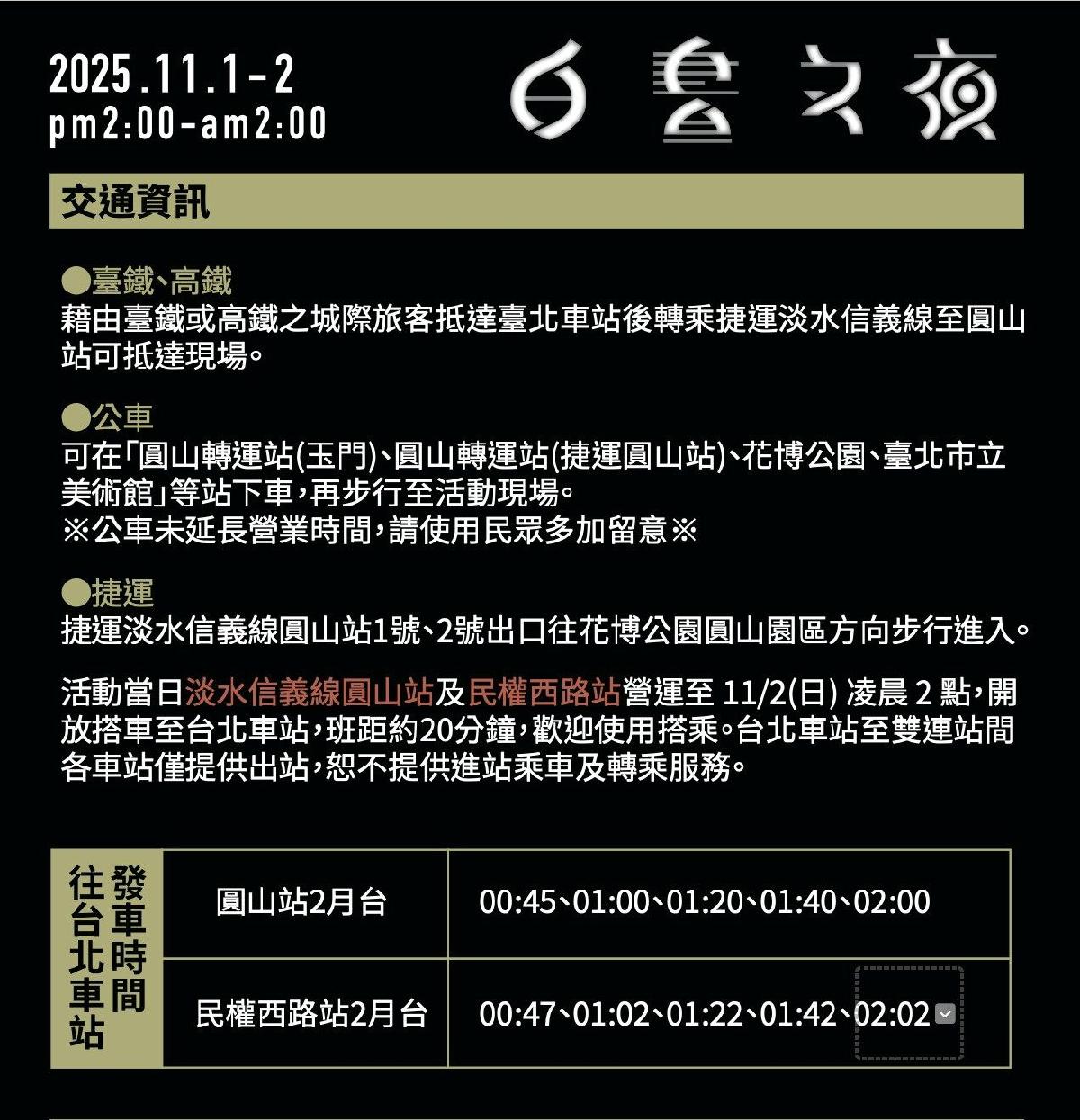 活動當日淡水信義線圓山站及民權西路站延長營運至 11月2日(週日)凌晨2時,開放搭乘至臺北車站,班距約20分鐘。