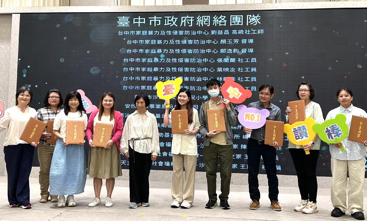 社團法人台灣防暴聯盟今(31)日舉辦第13屆「保護服務網絡之承諾與行動-菁網獎」頒獎典禮,台中市家庭暴力及性侵害防治中心展現網絡合作,榮獲2個優選及1個佳作,連續兩年獲得最多獎項。社會局主任秘書侯淑茹率隊北上領獎,感謝評審肯定台中市防暴團隊努力網住個案人身安全,一個都不漏接。